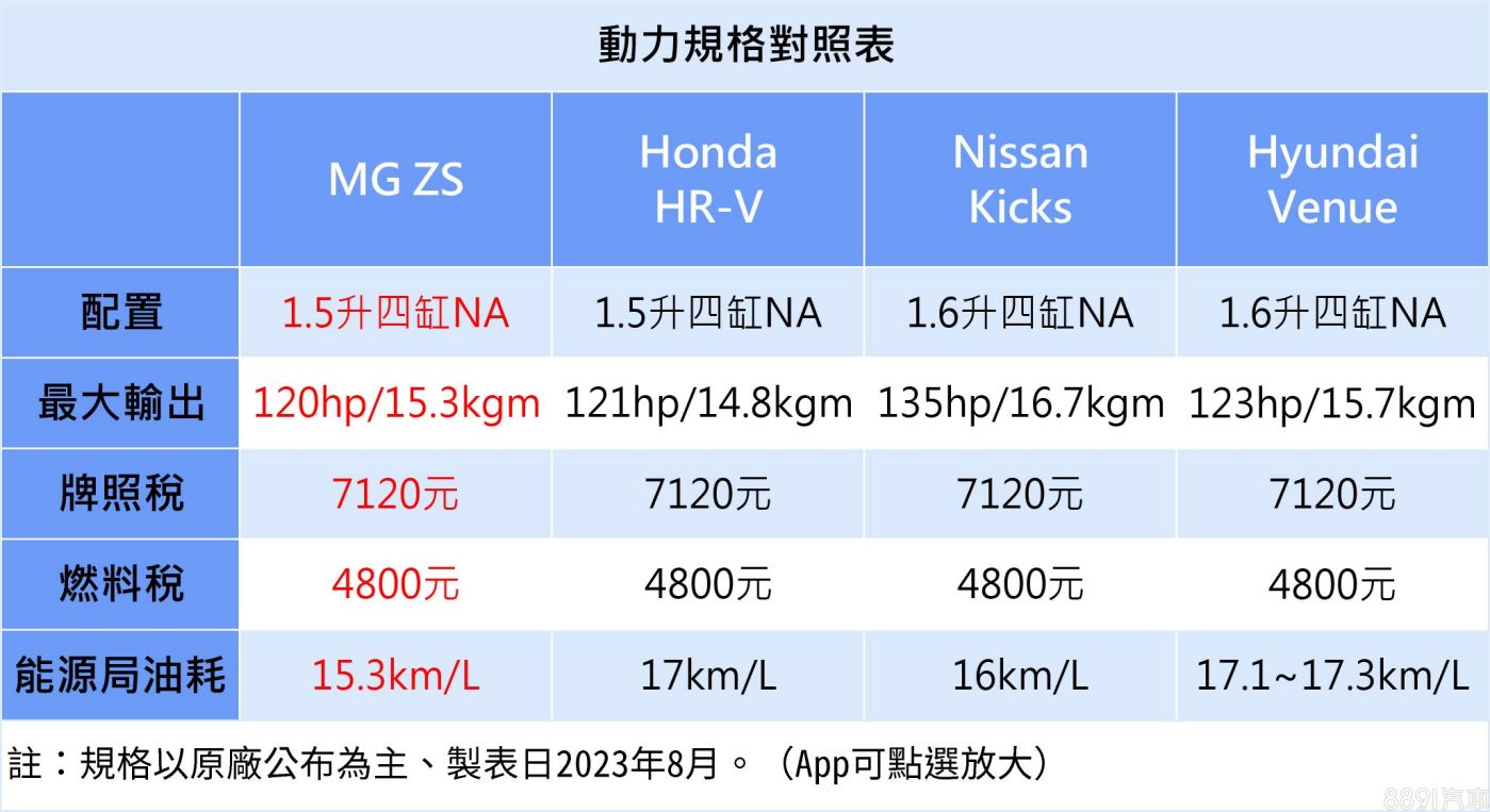 四車都採用自然進氣汽油動力,引擎排氣量也相當,為同樣的稅金級距,其中以Nissan Kicks輸出較為突出,而MG ZS的能源局平均油耗數據則略遜其他對手一籌。