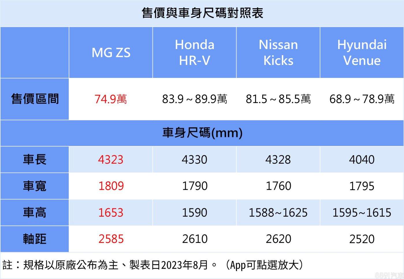 光看售價與尺碼,MG ZS並未佔到便宜,四車中僅Hyundai Venue尺碼明顯較其他對手小,也是最好入手的選項,不過ZS 74.9萬的售價,在同級中仍屬親民設定。