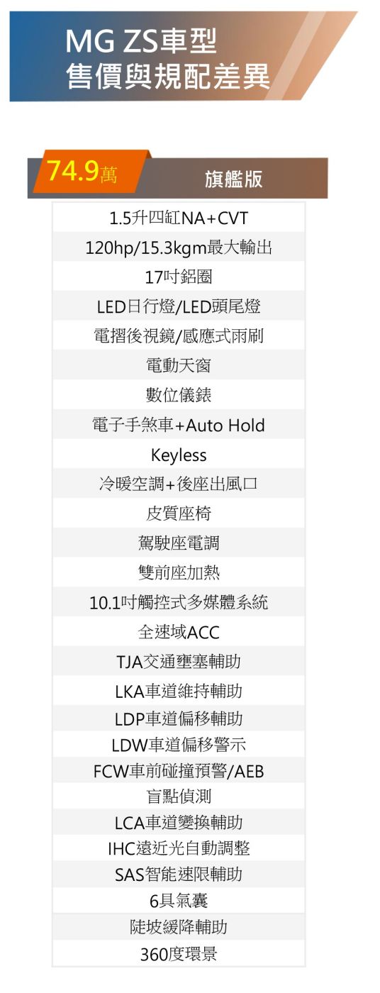 MG ZS在國內首波僅提供單一旗艦版車型,售價為74.9萬元,和先前網路謠傳的50~60萬有點差距,不過說實話就其堪稱「滿配」的配備設定來看,確實算是物有所值,至於是否「物超所值」?直接和對手比一比!看看新車產品力究竟如何?