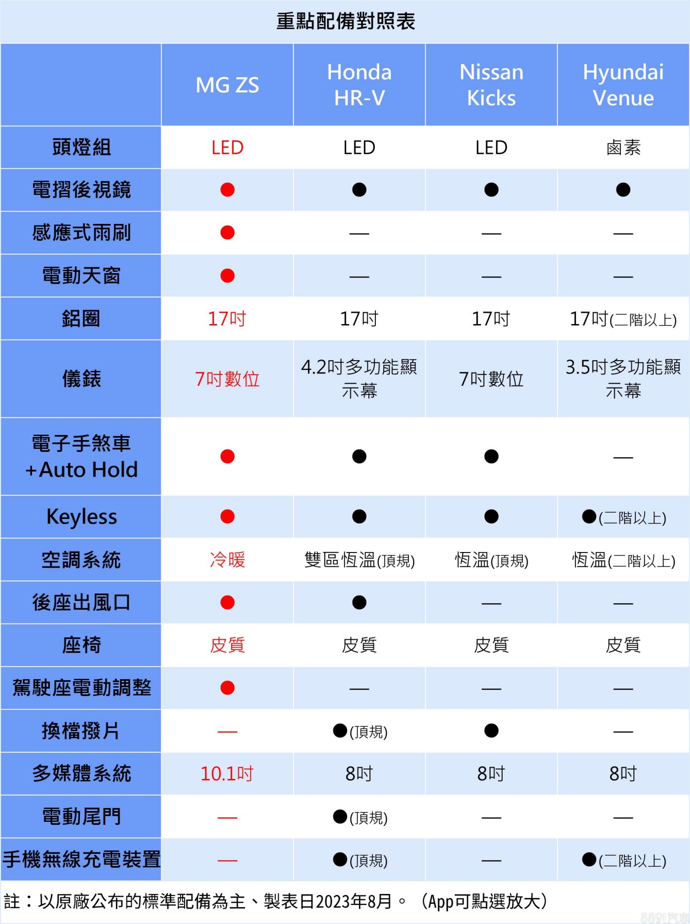 Hyundai Venue和Nissan Kicks的配備豐富度確實不如MG ZS、Honda HR-V,而ZS和HR-V之配置算是「各有所長」,不過HR-V唯頂規堪稱滿配,在售價較高的前提下,ZS顯然C/P值更加突出。