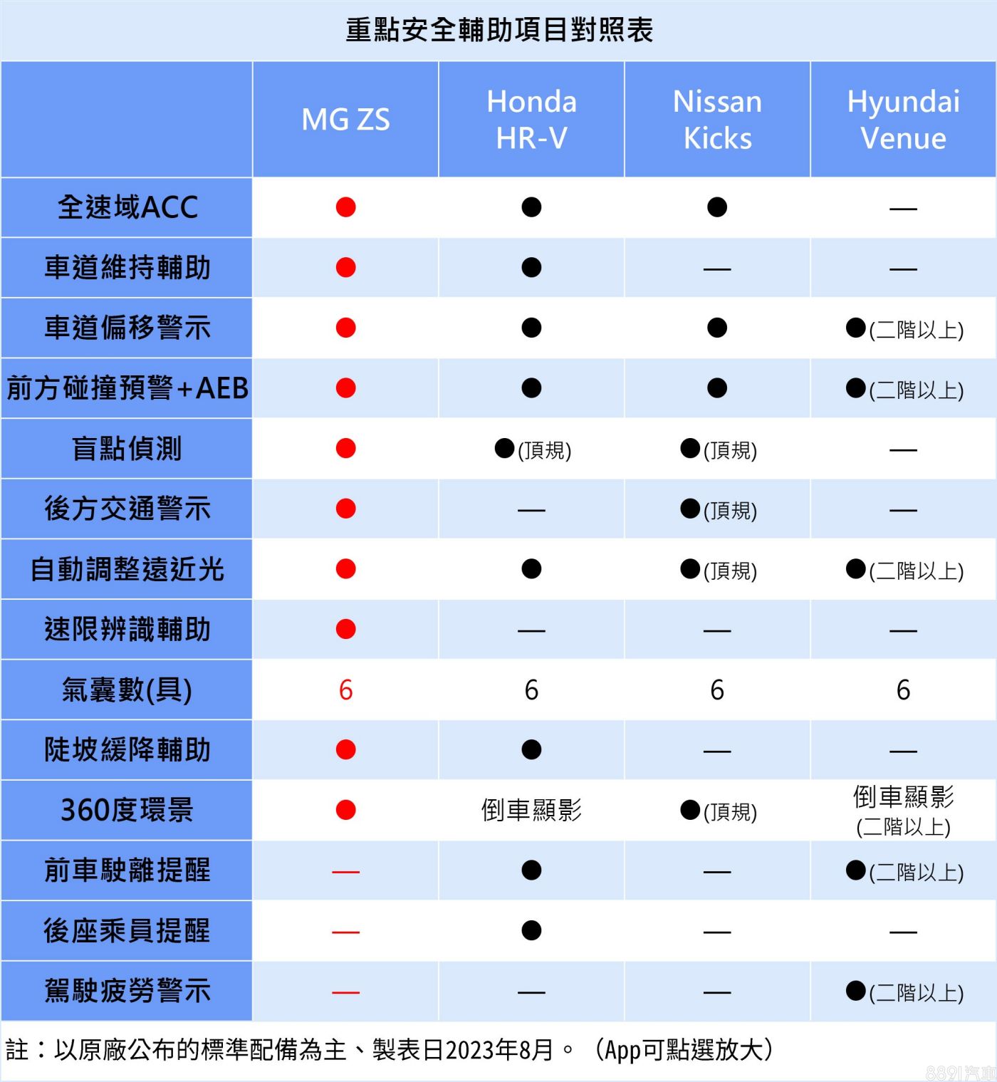 都標配符合Level 2自駕標準主動安全科技的MG ZS、Honda HR-V,安全輔助配備的齊全程度同樣不相上下,也明顯較Hyundai Venue和Nissan Kicks更加豐富,不過ZS擁有的速限辨識,以及360度環景便利實用性確實頗高,對新車來說是挺加分的配置。