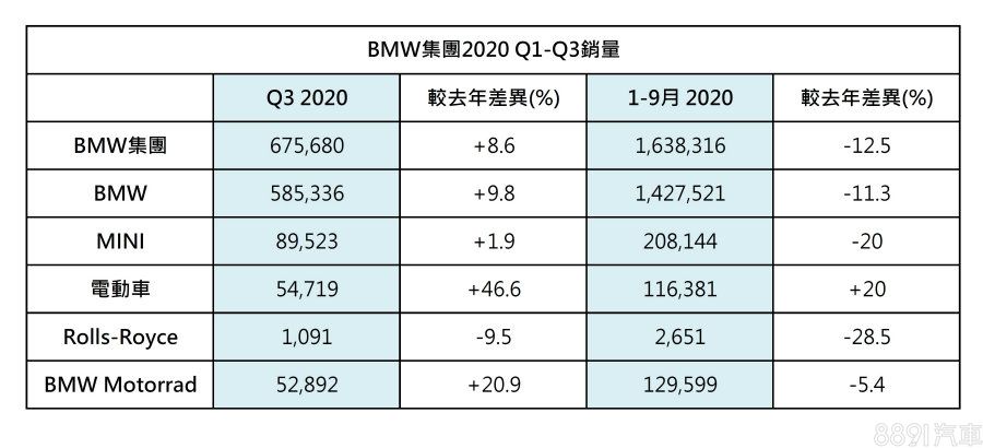 BMW集團近日公佈今年截至第三季的銷售數據,繳出1638316輛,較去年衰退12.5%的成績單,受新冠肺炎疫情衝擊,今年車市一片愁雲慘霧,拆開各品牌來看,BMW貢獻1427521輛(-11.3%)、MINI則售出208144輛(-20%),即便是車王勞斯萊斯也慘跌28.5%,僅交車2651輛。