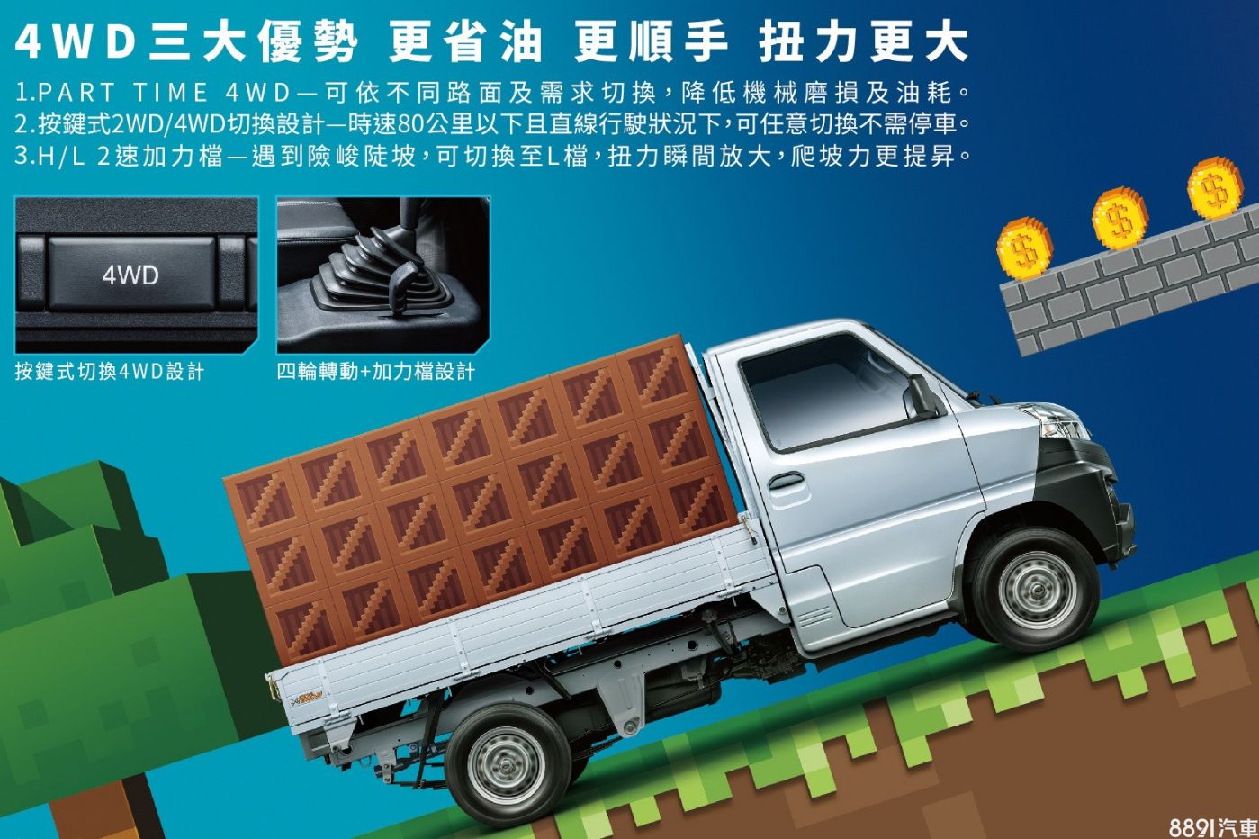 以國內輕型商用車霸主-中華菱利來說,超過9成的市占率讓對手難以望其項背,除了品牌口碑和完善的後勤能力作為後盾,產品設定十足在地化,其中一點就是具備4WD車型,如果頭家們有行駛山區以及非鋪裝路面的使用情形,這時候4WD系統的穩定性就派上用場,即使多半在市區開車,碰到下雨的溼滑路面也多一分安全,是個對手辦不到的優勢,看到最近登場的Toyota Town Ace,就沒有提供4WD版本,不像中華菱利可以滿足多方面需求。