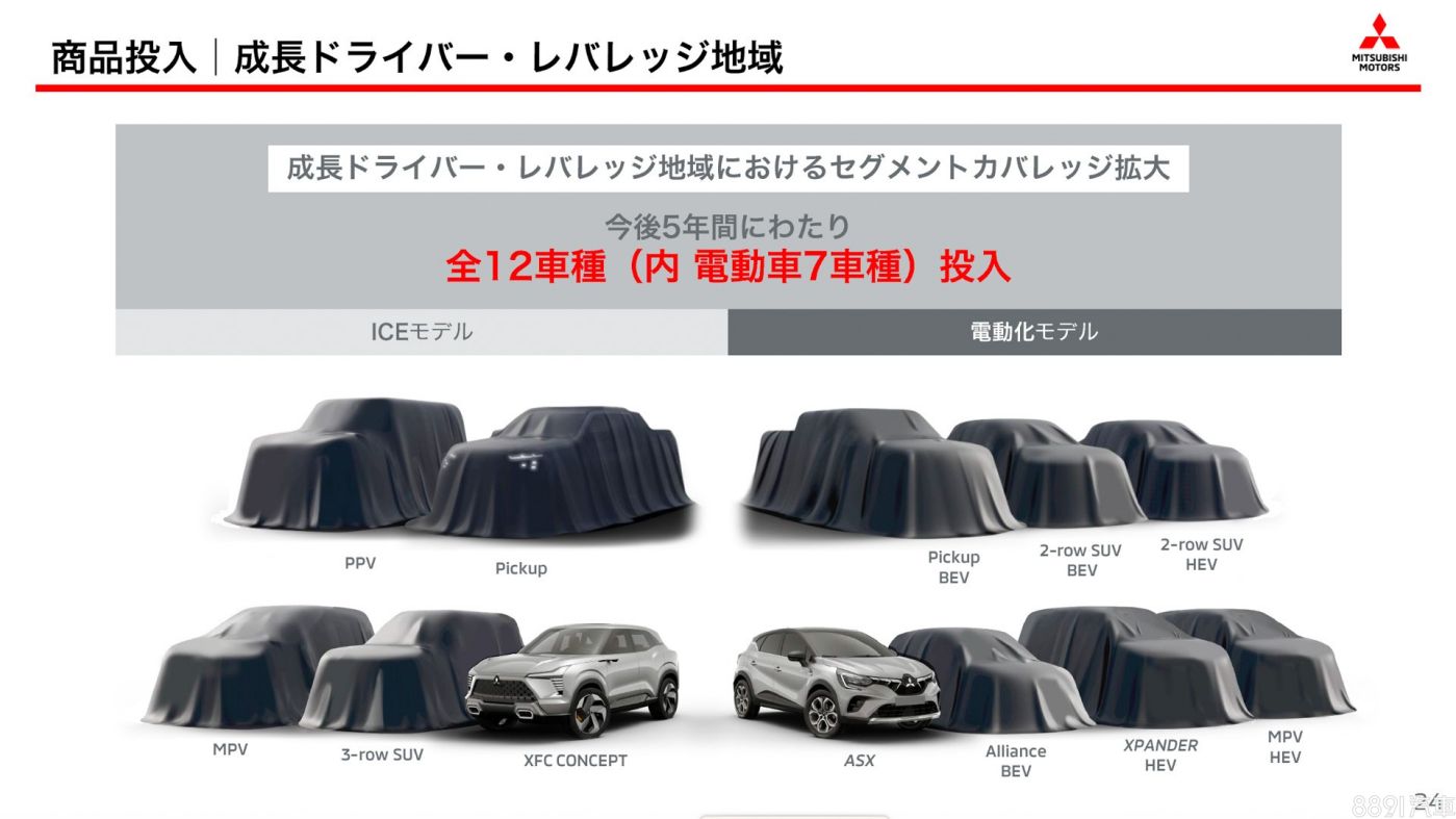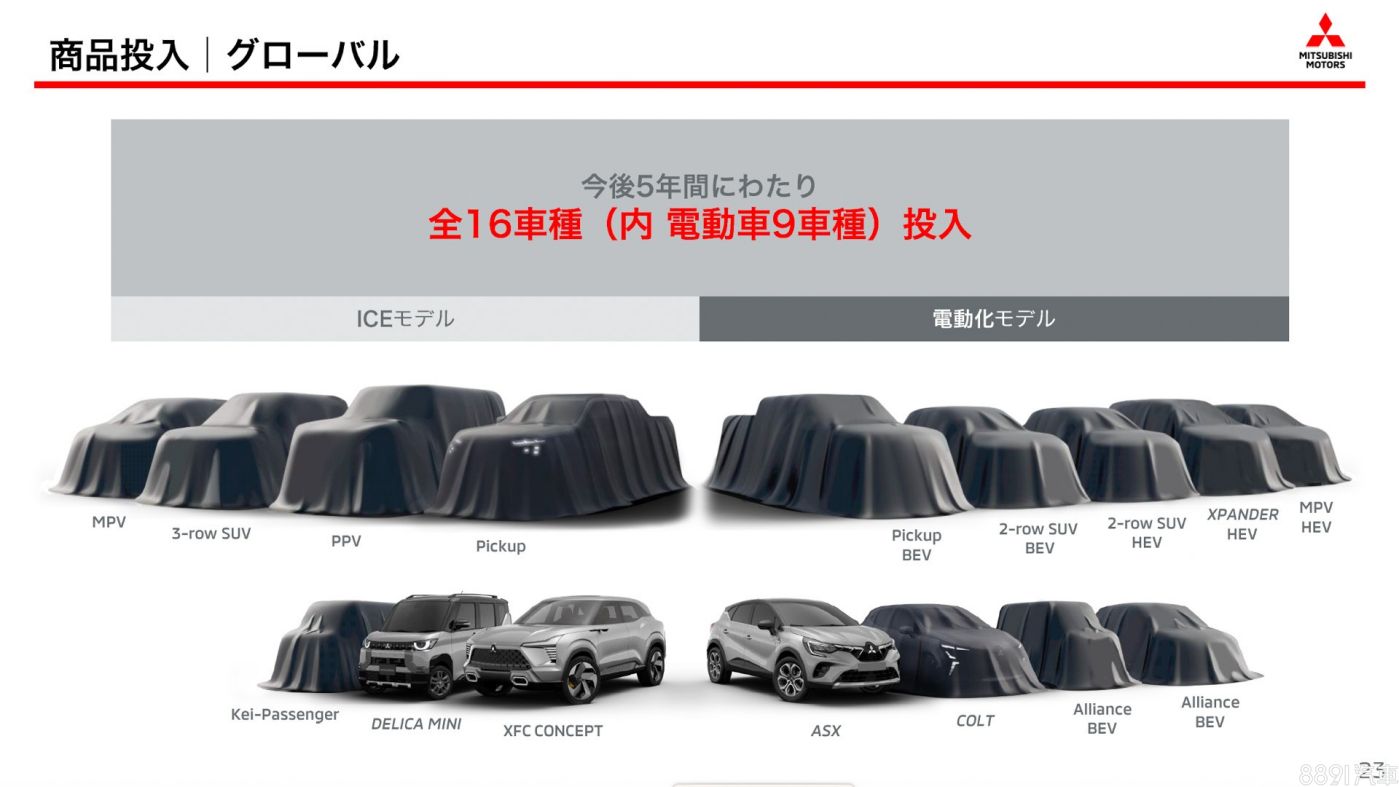 自官方簡報可見,即將問世的7款燃油車,除了Delica Mini以及準備推出量產版的XFC Concept之外,還將包含MPV、三排座SUV、皮卡、皮卡式SUV、輕型車等產品,其中皮卡被視為三菱Triton/L200的後繼車款,將會借用集團資源做開發、成為Nissan Navara的「兄弟車」,並會再以此為基礎衍伸出皮卡式SUV,作為Pajero Sport的替代品。