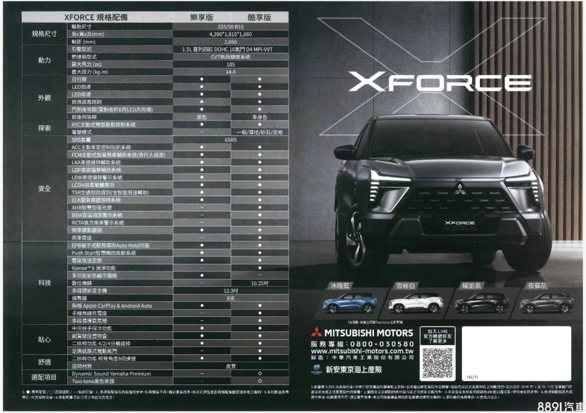 中華三菱今日宣布旗下備受矚目的全新跨界休旅XForce,將於11月3日正式展開預售接單,入門的「樂享版」預售價直接定在79.9萬元!然而,根據網路上提前流出的詳細規格配備表來看,雖然入門價格相當有競爭力,但想要擁有完整的產品體驗,消費者的目光恐怕還是得望向84.9萬元的高階「酷享版」。