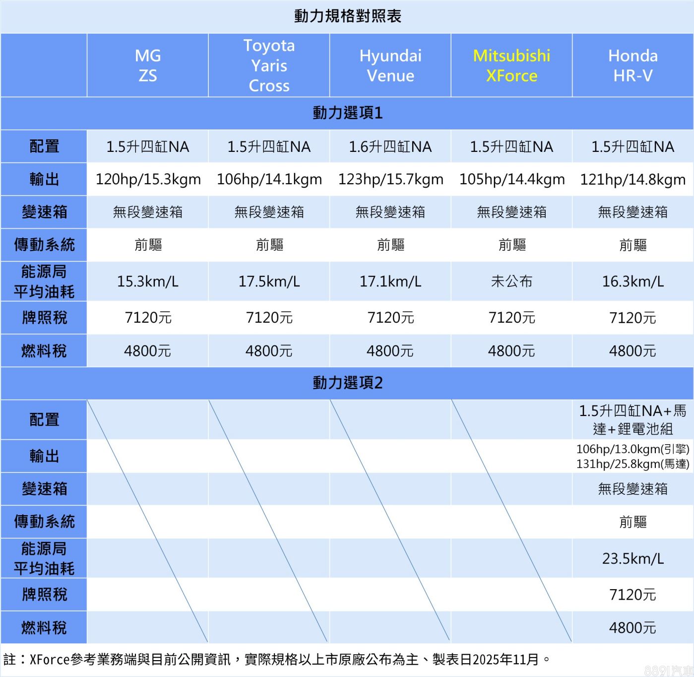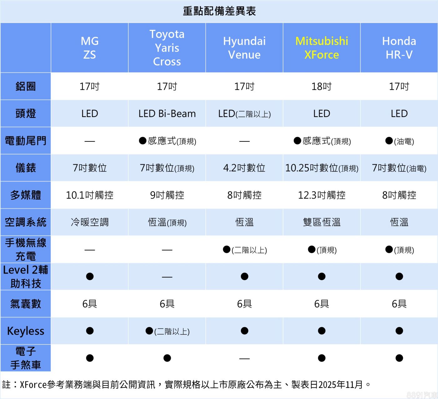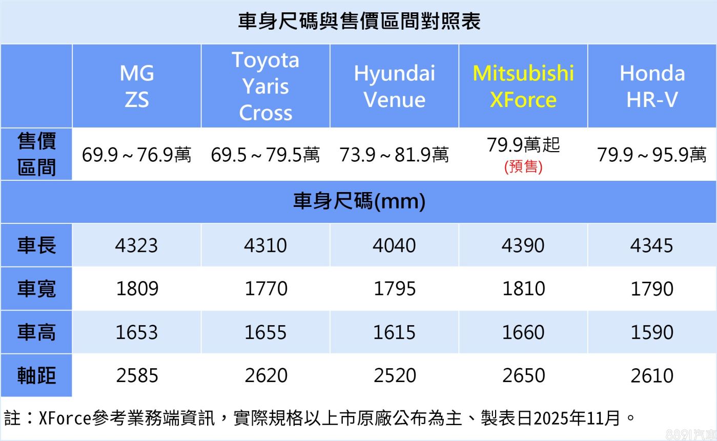 國產化身分的Mitsubishi XForce,定位為入門小型休旅,主打C/P值與都會多功能訴求,同級產品包含MG ZS、Toyota Yaris Cross、Hyundai Venue,以及Honda HR-V等,雖說此級距並非「一線戰場」,但依舊不乏強勢對手,XForce能否交出漂亮的成績單,還是得看端出的牛肉大不大塊。