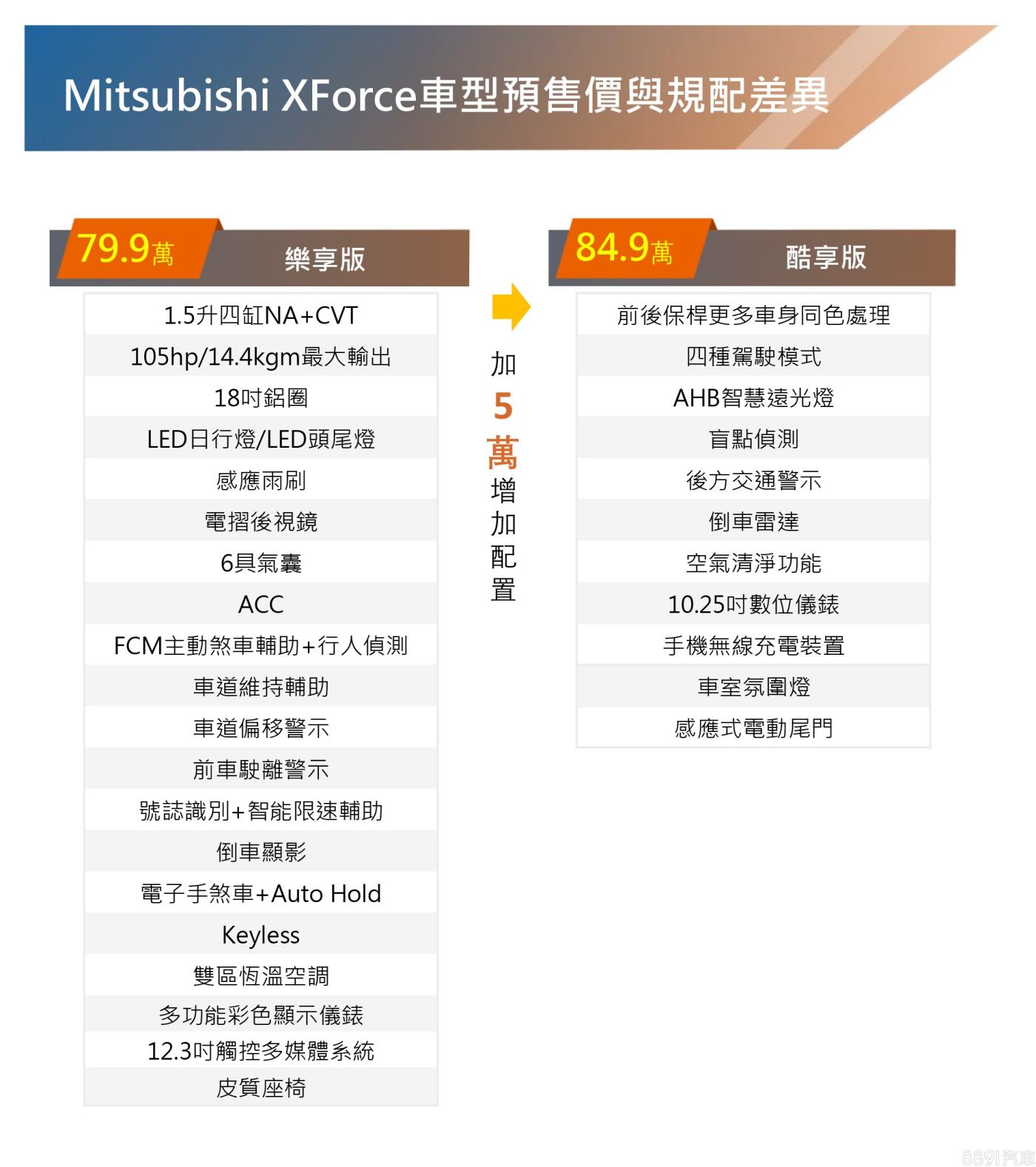 中華三菱近年來推出的新世代產品,像是Zinger、J Space,都繳出亮眼的成績單,自主研發的3.5噸電動貨卡ET35也於日前正式上市,不過畢竟都屬於商用取向,在乘用車方面,旗下產品多半「年事已高」,也因此這回XForce的推出備受關注,這台三菱睽違已久的全新車,就目前公布的資訊看來,許多好康還是得至頂規始為標配,預售79.9萬的入門車型在價格和配置方面都佔不到便宜,倒是頂規、84.9萬元相較同級頂規版本,雖然不是最便宜,但擁有獨門配置,也更能突顯賣點。