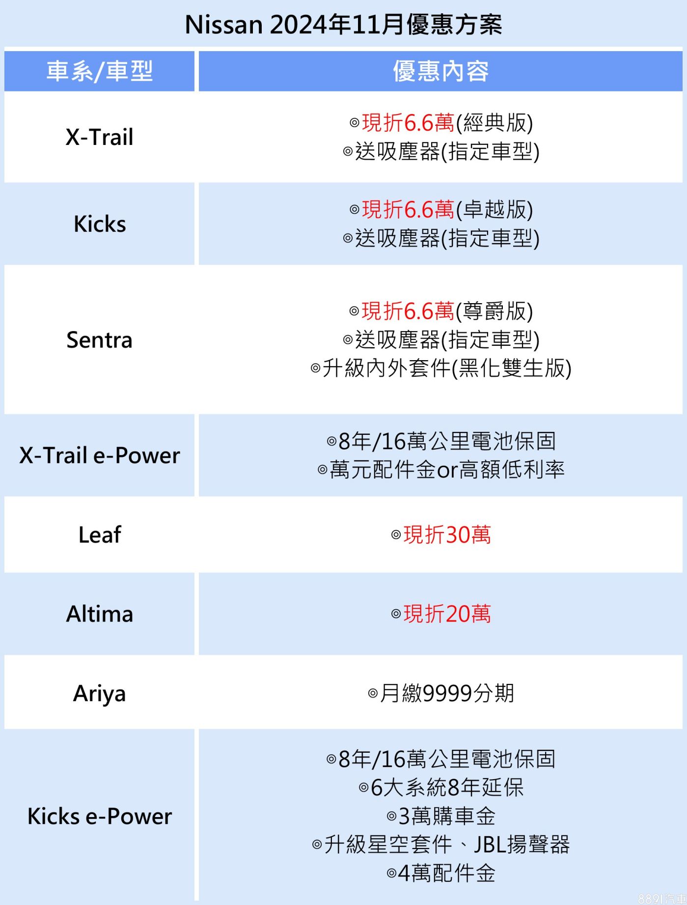 最實在的現金優惠部分,Leaf和Altima除了持續於本月分別下殺30、20萬元外,熱門國產車系如Sentra、Kicks、X-Trail等指定車型,都可享6.6萬購車金優惠。