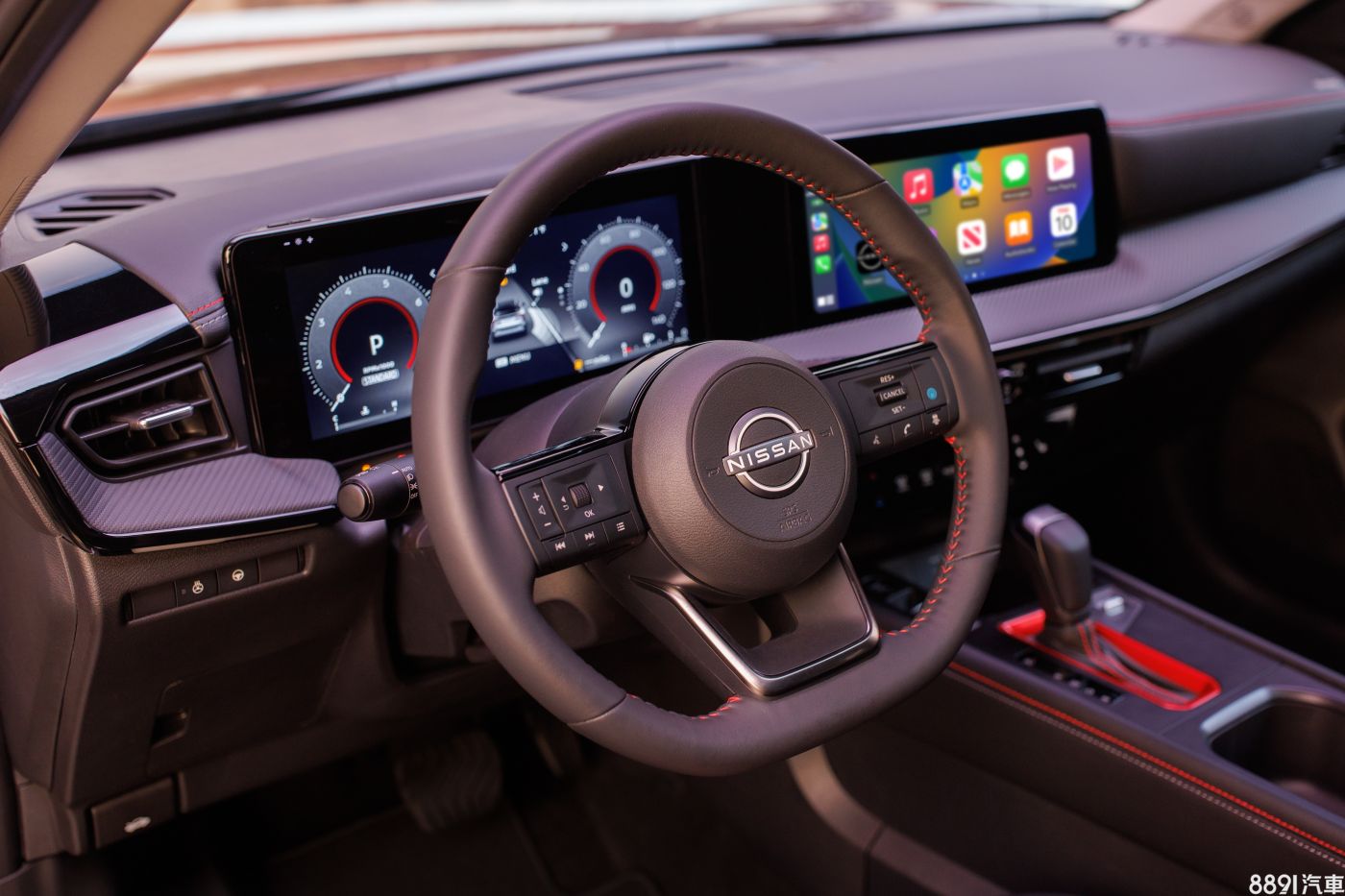 新一代Kicks內裝採用水平線條環艙設計,搭配兩具相連的螢幕,讓座艙看起來相當簡潔清爽。配置方面,數位儀錶標配為7吋,頂規SR版本升級為12.3吋,中央觸控螢幕則是標配7吋,中階以上升等12.3吋,具備Apple CarPlay/Android Auto無線連接功能。