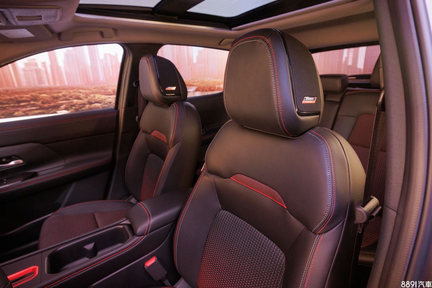 Kicks SR版本座椅採用橘紅色的鋪面,搭配中控台、排檔座、車門板等處也都用上橘紅色的縫線點綴,營造出不俗的運動氛圍,而部分喇叭整合在頭枕內的Bose音響系統也下放Kicks選配,不過僅限SR版本能夠加選。