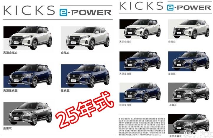 唯一改動地方為車色,取消白頂星夜藍、黑頂晨霧灰,現在Kicks e-Power雙色僅剩下黑頂白、黑頂藍兩種,加上常規白、藍、灰,2025年式調整為5種車色選擇。