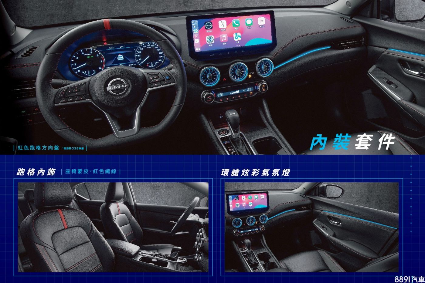 特仕版Sentra外觀升級多項配備,最搶眼的當屬「藍紋頭燈」,在燈組內部採用吸睛的藍色飾框,搭配黑化水箱護罩、黑化保桿飾條與黑化鋁合金輪圈,夜晚甚至還有搶眼的迎賓光流照地燈,相比標準版更顯個性化。