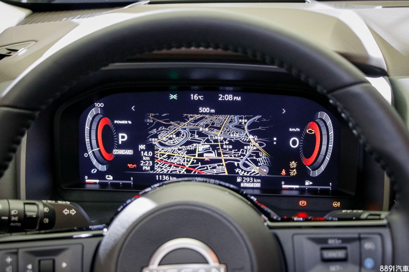 數位儀錶具備繁體中文介面,兩側固定為車輛輸出資訊,採立體環狀顯示,右側為時速錶,左側則為電耗狀態,畫面中央區域則可切換導航、影音、駕駛輔助系統等資訊。