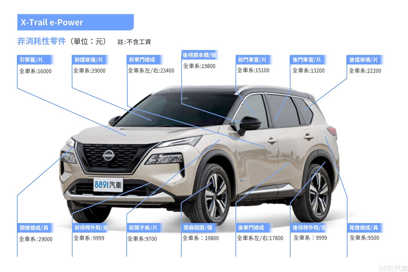 X-Trail e-Power外觀零件價格合理,引擎蓋1.6萬元、頭燈單邊2.9萬元、前後保桿各約1萬元,以進口身份來說這樣的價格並不誇張,不過全車玻璃便要價不斐,前後側窗玻璃分別約1.5萬、1.3萬,前檔玻璃更是來到2.9萬元,不過相信國產版X-Trail問世後,部分零件也將國產化,全車玻璃或許將會有更平價的選擇。