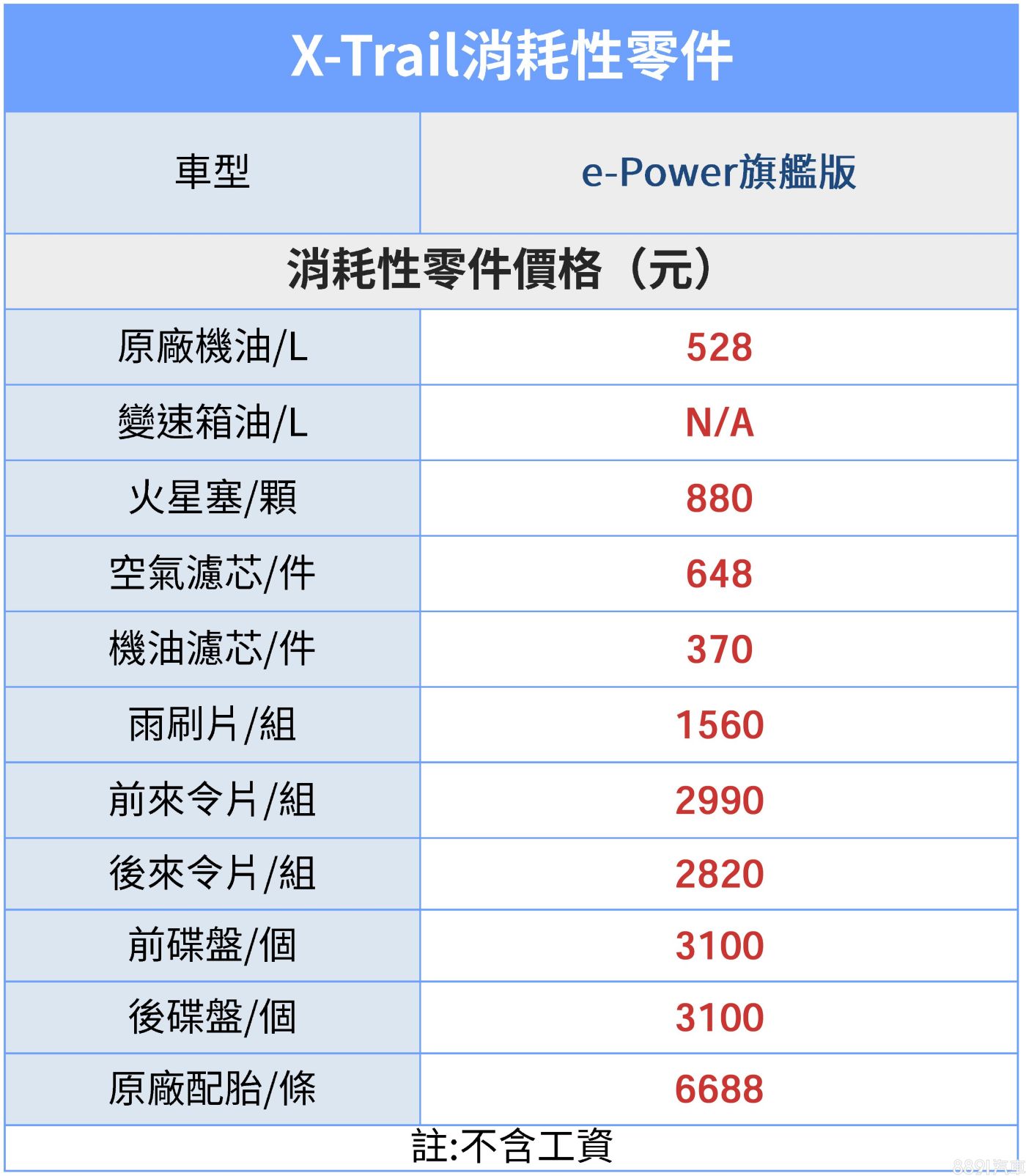 X-Trail e-Power消耗性零件價格平實,沒有太過誇張的報價,就連235/55R19 Hankook Ventus S1 evo3運動胎款原廠也僅報價6688元,對比外廠並沒有顯著價差。值得注意的是e-Power動力沒有變速箱,因此並沒有變速箱油報價,省一筆。