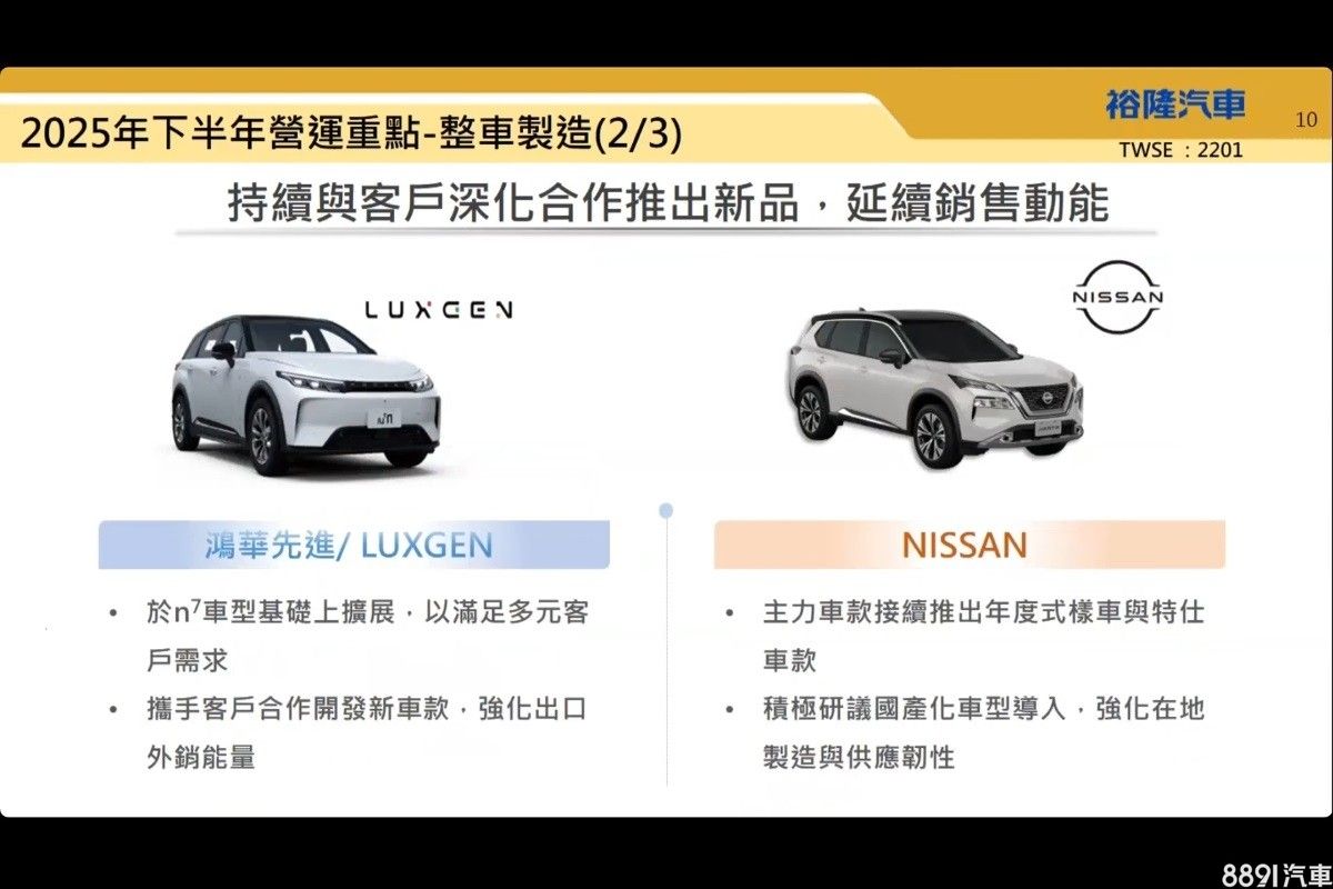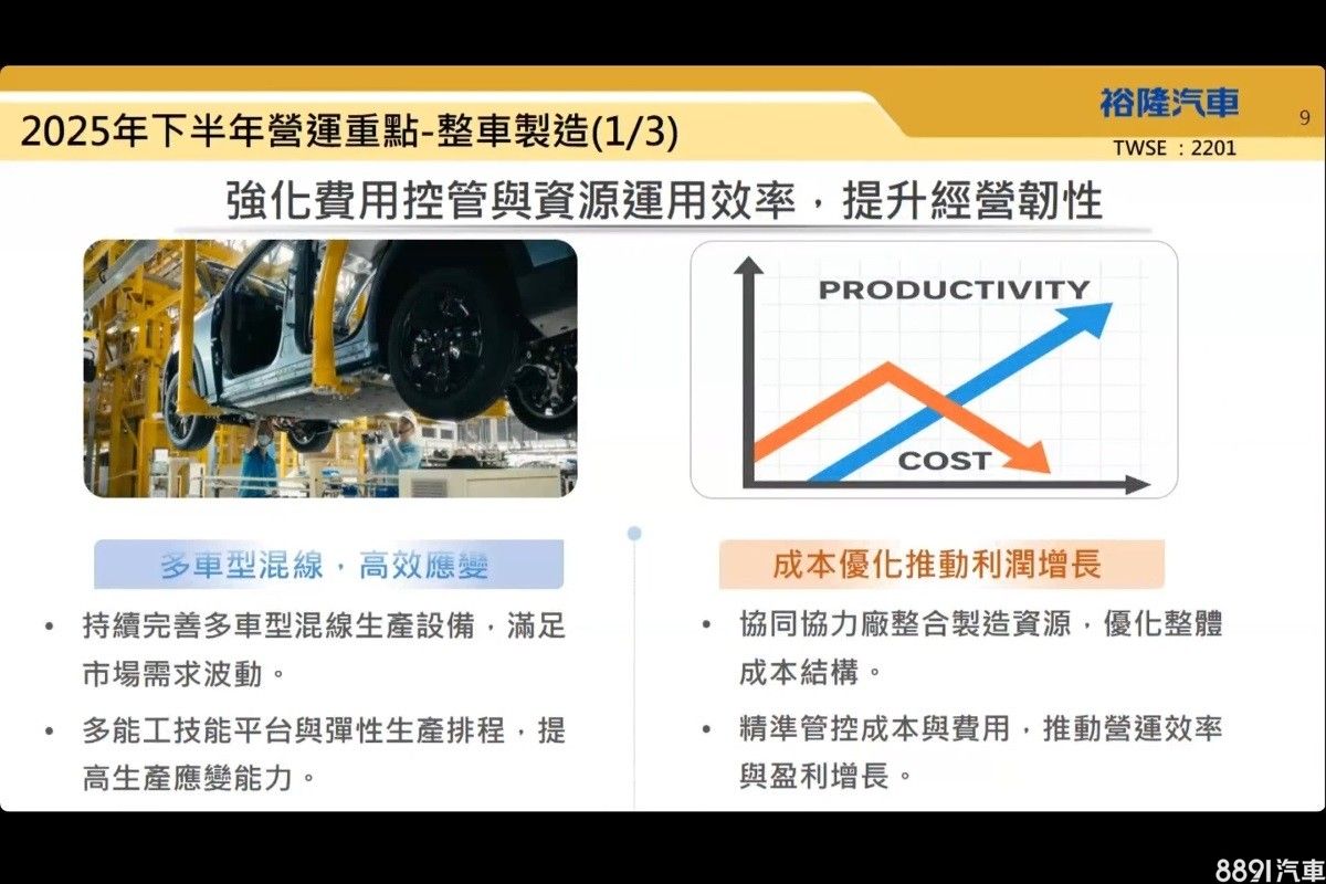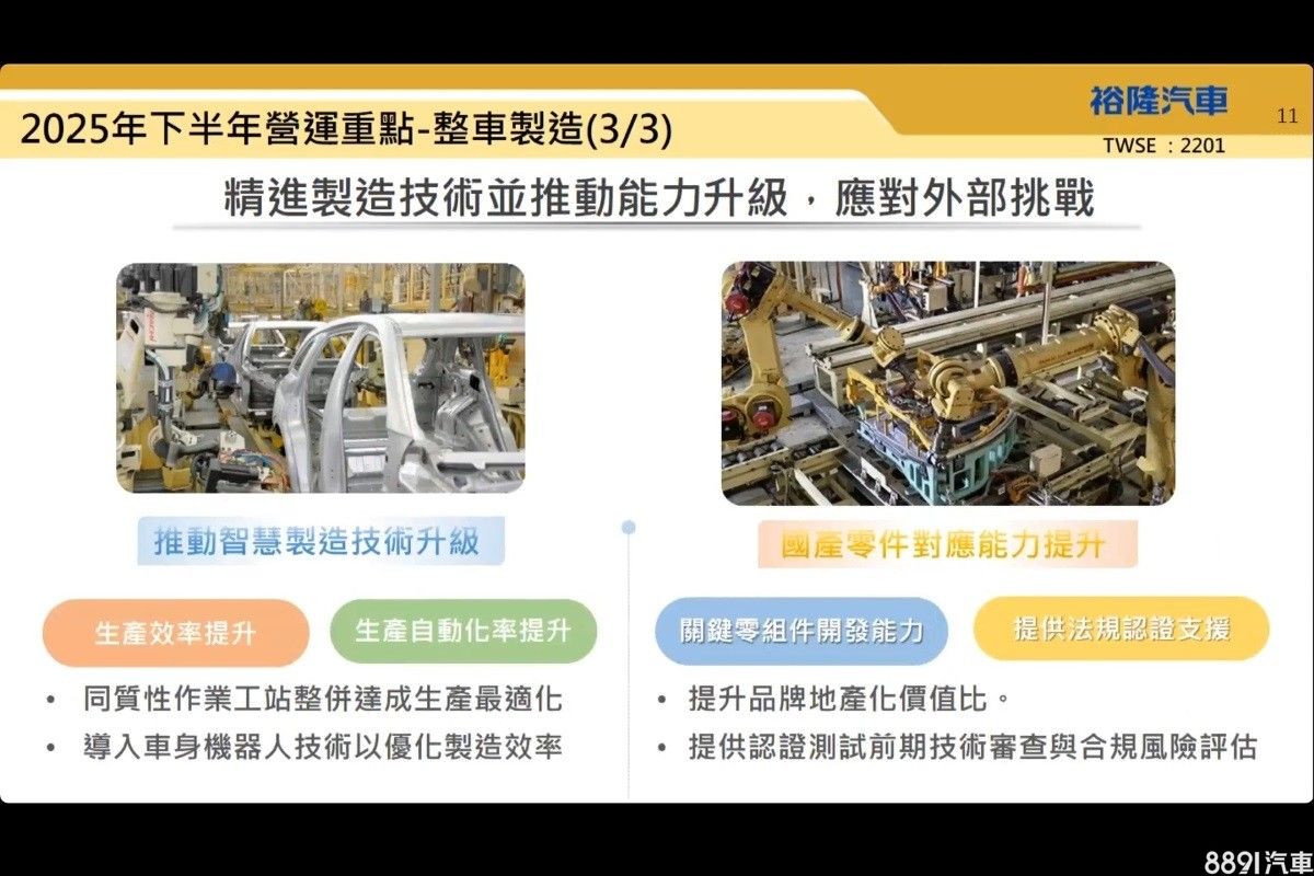 而裕隆汽車下半年營運重點放在「整車製造」,強化國產車的費用控管,提升資源運用效率,例如將持續完善多車型混線生產設備,滿足市場需求波動、加強彈性生產排程。