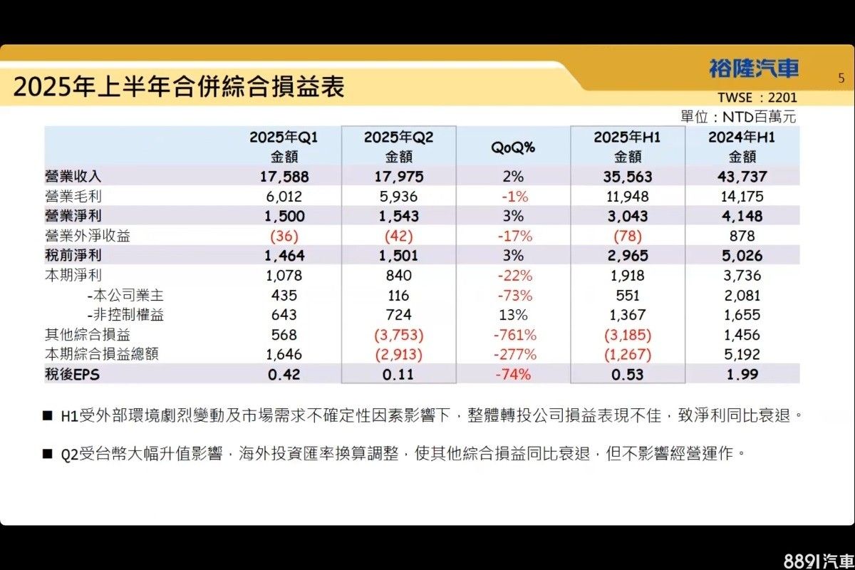 攤開財報,裕隆汽車2025上半年營收355.63億元、跌幅18.5%;稅後淨利5.51億元、年減73.6%;每股稅後盈餘(EPS)為0.53元,相較去年同期的1.99元大跌74%。雖說買氣降溫直接反映在財務表現上,但裕隆認為掛牌數下降,主因是車市買氣趨於保守,盼政府關稅政策能早點定案,讓消費市場回歸正常。