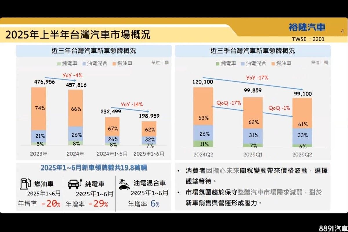 裕隆汽車近日舉辦法人說明會,除了回顧2025上半年的銷售表現外,同時也公布了下半年營運重點。首先,今年1~6月車市掛牌約19.8萬輛,相比去年同期衰退14%,裕隆指出買氣冷凍,跟關稅不確定性有關,消費者擔心未來關稅變動可能帶來價格波動,因此傾向先觀望等待,而大量新車塞港,也對銷售與營運造成不小壓力。
