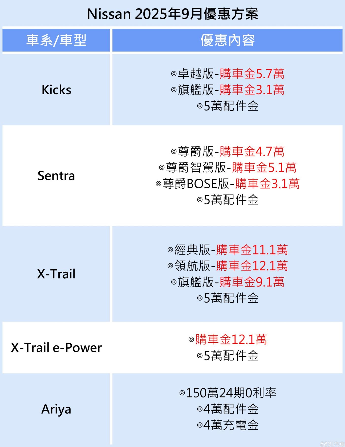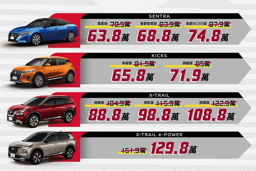 包含Kicks、Sentra和X-Trail全車系,都可享有購車金優惠,其中X-Trail幅度最大!經典版、領航版旗艦版和進口的e-Power版本,各祭出11.1、12.1、9.1和12.1萬折價,並加贈5萬配件金!