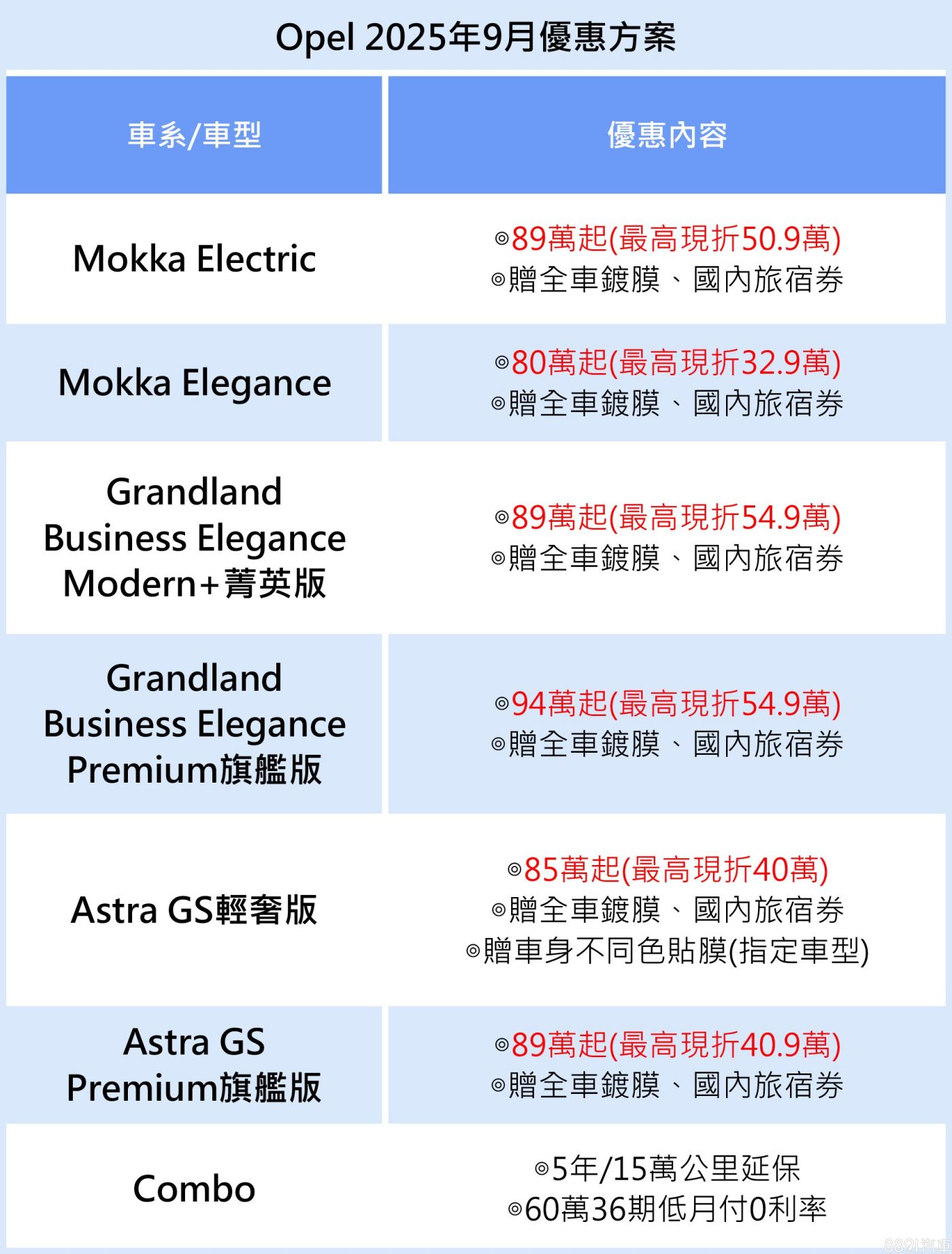 歡慶Opel重新導入台灣三週年,特別推出三週年感恩特惠專案。9月入主Combo,加贈5年/15萬公里延長保固以及60萬36期低月付0利率專案。其他全車系指定車型,除了贈全車鍍膜、國內旅宿卷,更有高達逾50萬元的現金折價優惠。
