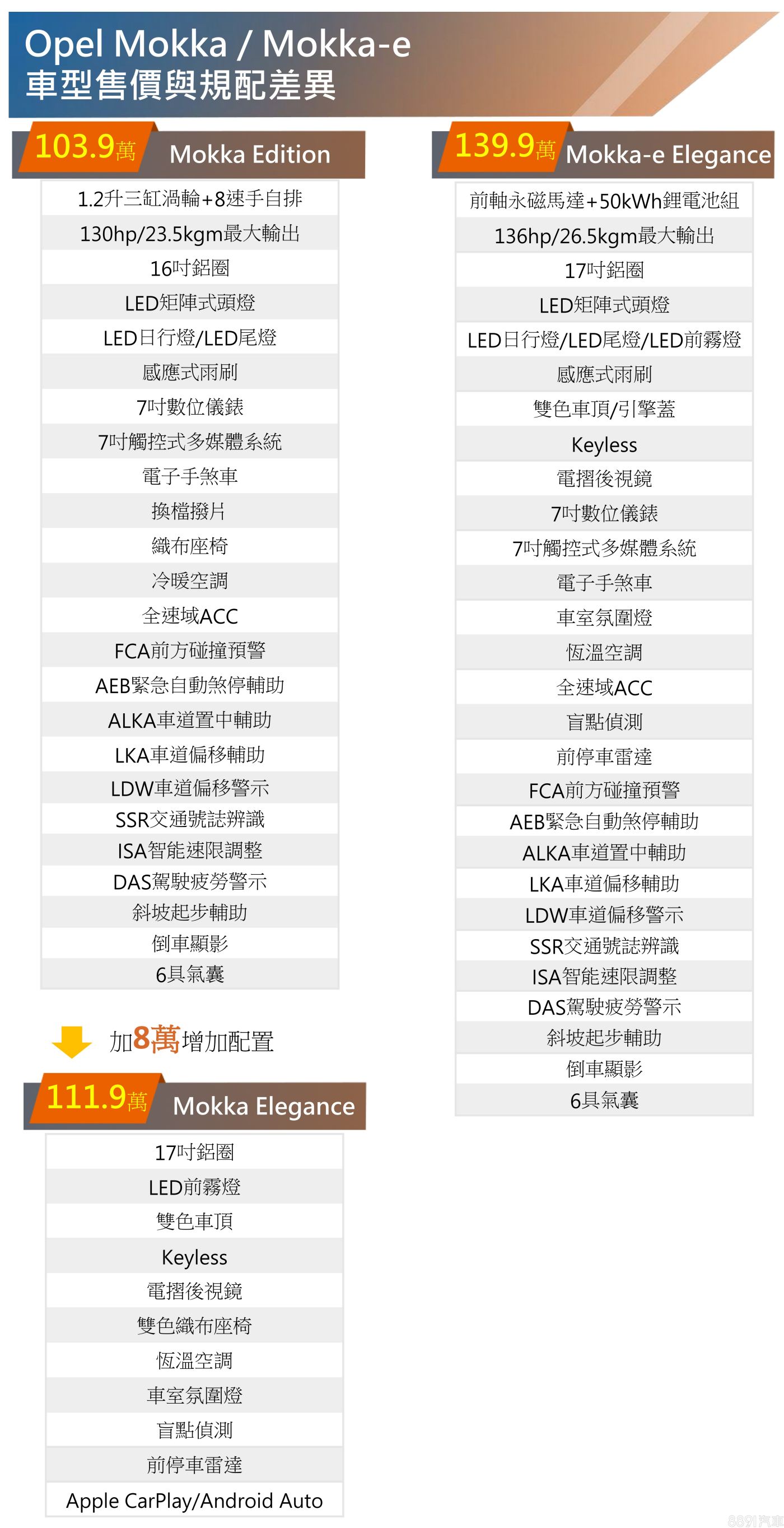 純電版Mokka-e則採單馬達前驅配置,出力136hp/26.5kgm,50kWh的鋰離子電池組藏身座艙下方,按WLTP標準續航力為338km。國內車型採CCS1介面,原廠宣稱搭配100kW直流快充,Mokka-e半小時可完成0~80%充電。