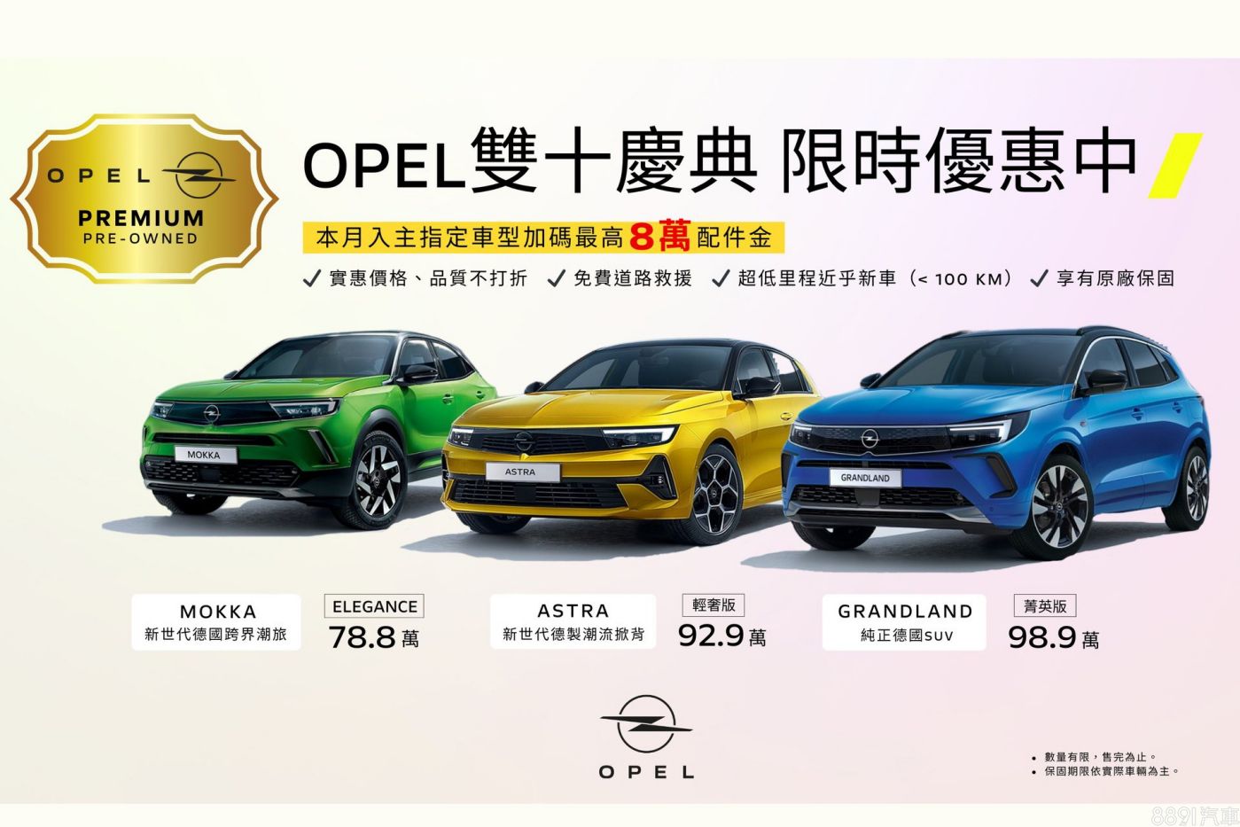 本月入主Opel全車系指定車型,價格「殺很大」,依車型不同,折價區間自14.9萬至36.9萬不等。另外均可享配件金,依車型不同,自5萬至10萬不等,詳情可洽官網或展示中心查詢。