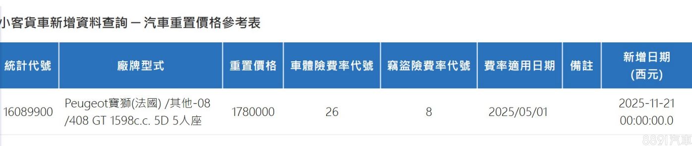 保發中心汽車重置價格資訊中,稍早更新了一輛Peugeot 408新車型,178萬的重置價格遠高於現行款119.9~137.9萬的價格帶;且特別的是,有別於國內現售陣容清一色搭載1.2升油電,登錄的新車配備了1.6升油電,到底這葫蘆裡到底賣什麼藥?