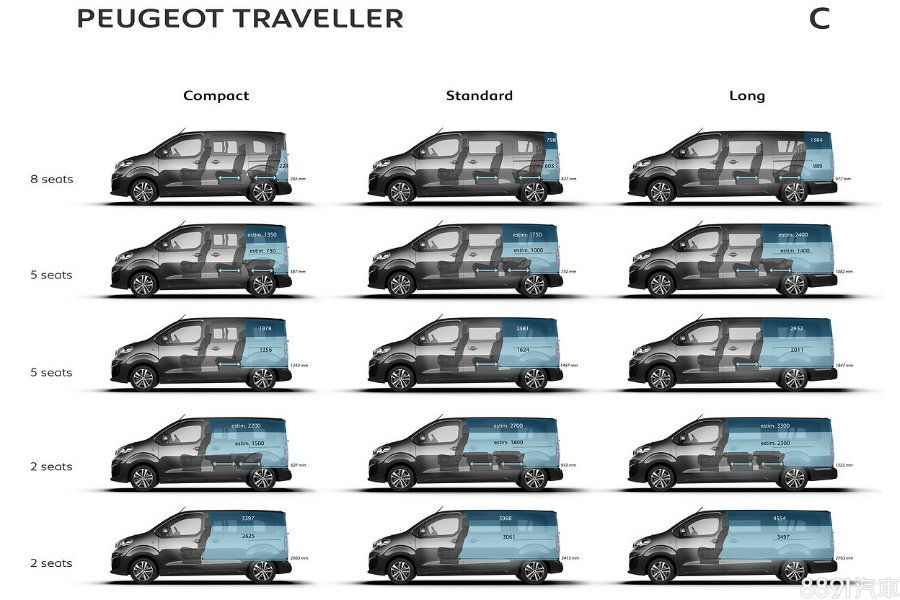 如同標準版,e-Traveller也提供五人座短軸版及長軸車型可選,後者之座位安排可依客製需求承載6~9人。此外,由於電池組安置在艙室之下,不至於壓縮座艙空間,讓e-Traveller在標準9座配置下仍具備1500L的尾廂容積,並在後兩排完全拆除後,能換取4900L的載物空間。