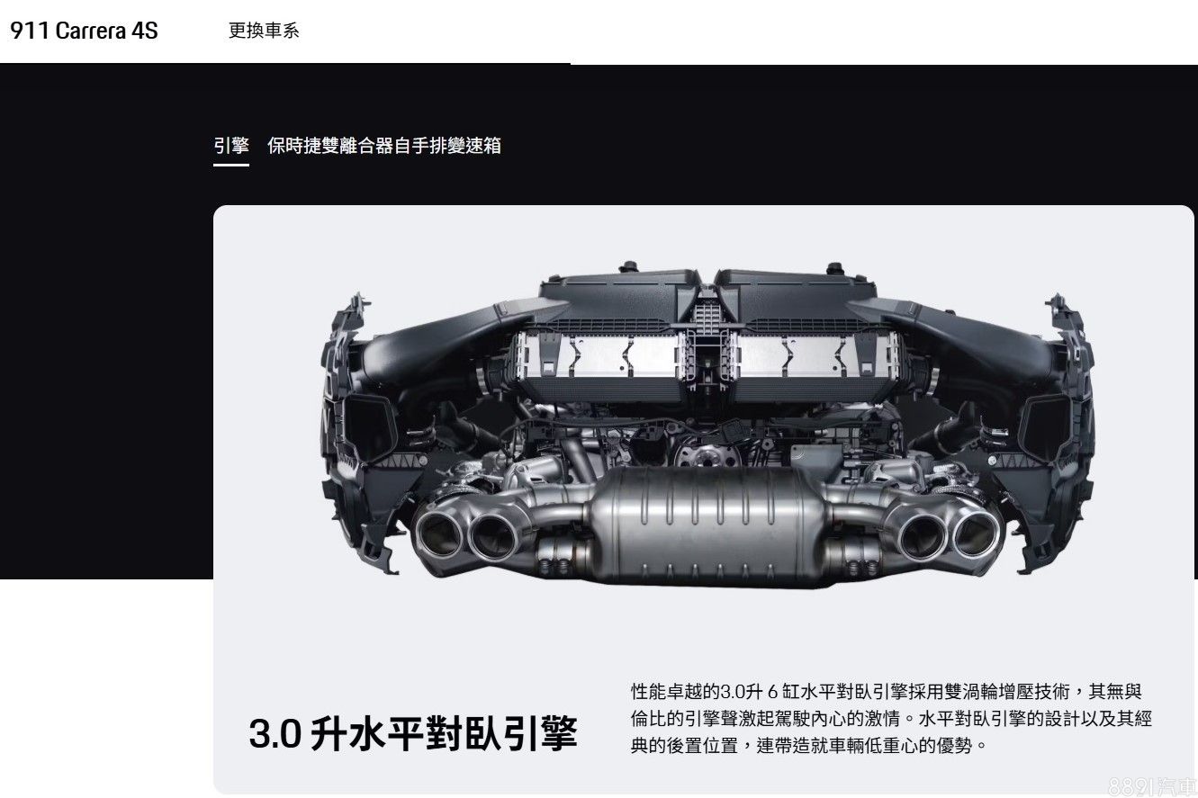搭載升級後的3.0升六缸水平對臥雙渦輪增壓引擎,最大出力480hp/54kgm,較舊款提升30hp輸出,動力透過8速PDK自手排傳遞至四輪,若選配跑車計時套件,零百加速僅需3.3秒、極速上看308km/h;而如同所有911四驅車型,全新Carrera 4S也採用後驅導向的動態設定,必要時,PTM保時捷循跡管理系統可將更多動力傳遞至前軸,提升抓地力與穩定性,前差速器採水冷式電控離合器,整體配置與前代相似,僅針對傳動比進行微調。