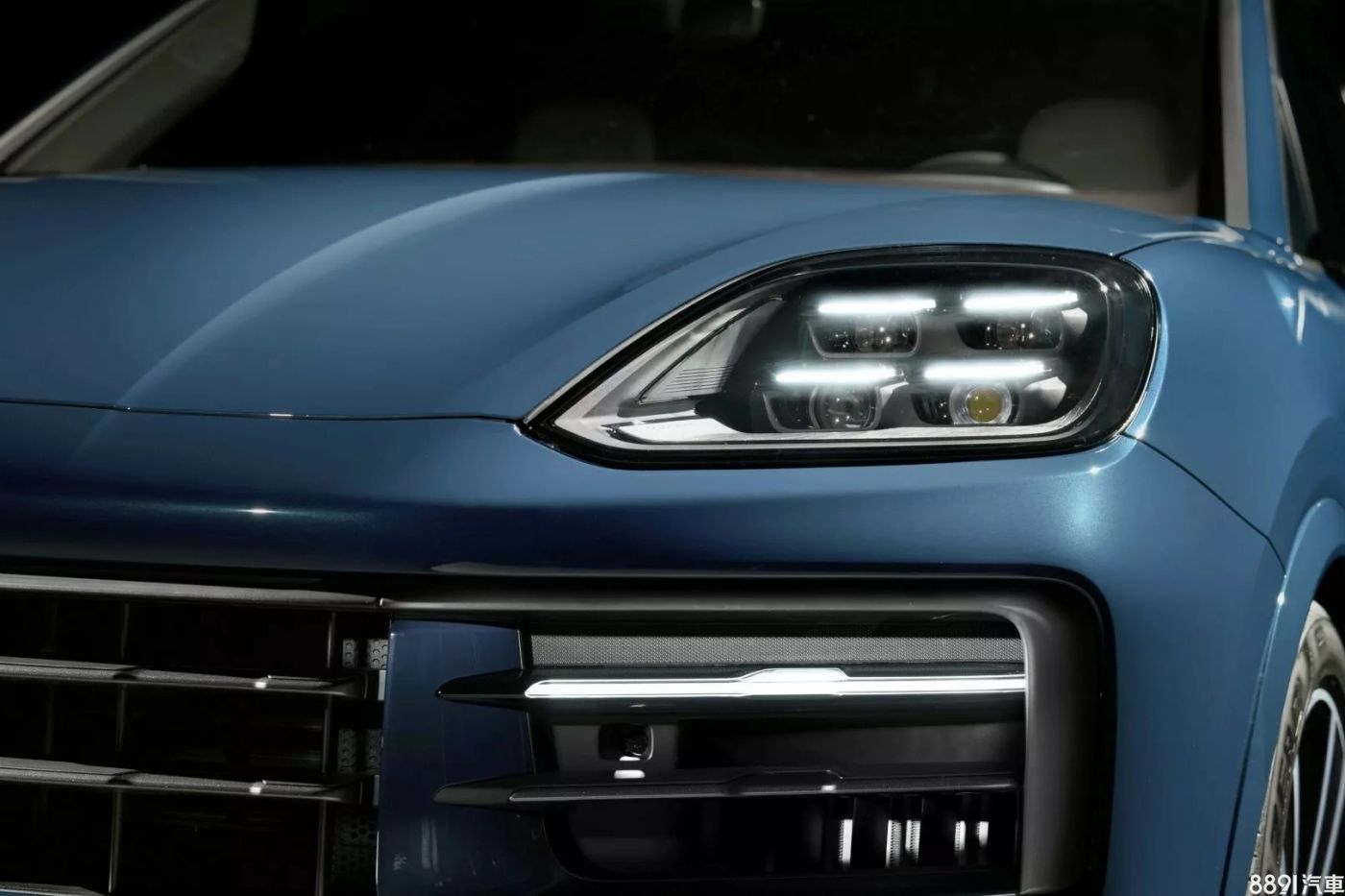 最新釋出的小改款Cayenne僅有車頭局部圖,焦點當然是新款頭燈,比舊款變得更稜角分明,四個矩形LED日行燈與Taycan設計類似,不過照明光源採用新的HD-Matrix LED技術,亮度不僅較舊款更強,最遠照射範圍預計可達600m,獨立的四組矩陣LED燈組也能帶來更細緻的光形變化。