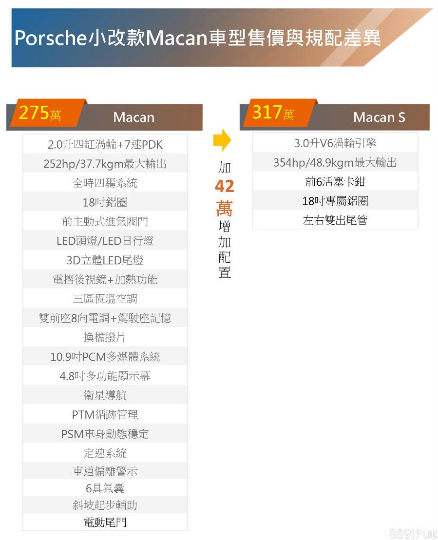 小改款Macan S則搭載與Panamera和Panamera 4,以及Cayenne相同的3.0升V6渦輪引擎,此具引擎與舊款差別在於,原廠針對包含引擎V型夾角、渦輪增壓器、排氣歧管等部分進行優化,使新車出力達354hp/48.9kgm,0~100km/h只需5.4秒就能完成,若選配跑車計時套件,則縮短至5.1秒,極速為254km/h。
