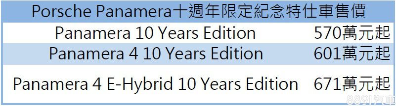 Panamera 10週年特仕車共三款車型,Panamera以及Panamera 4搭載3.0升渦輪增壓引擎,具備330hp動力輸出表現,Panamera 4 E-Hybrid搭配2.9升雙渦輪增壓引擎與136hp動力輸出之電動馬達,擁有最大462hp的綜效輸出。