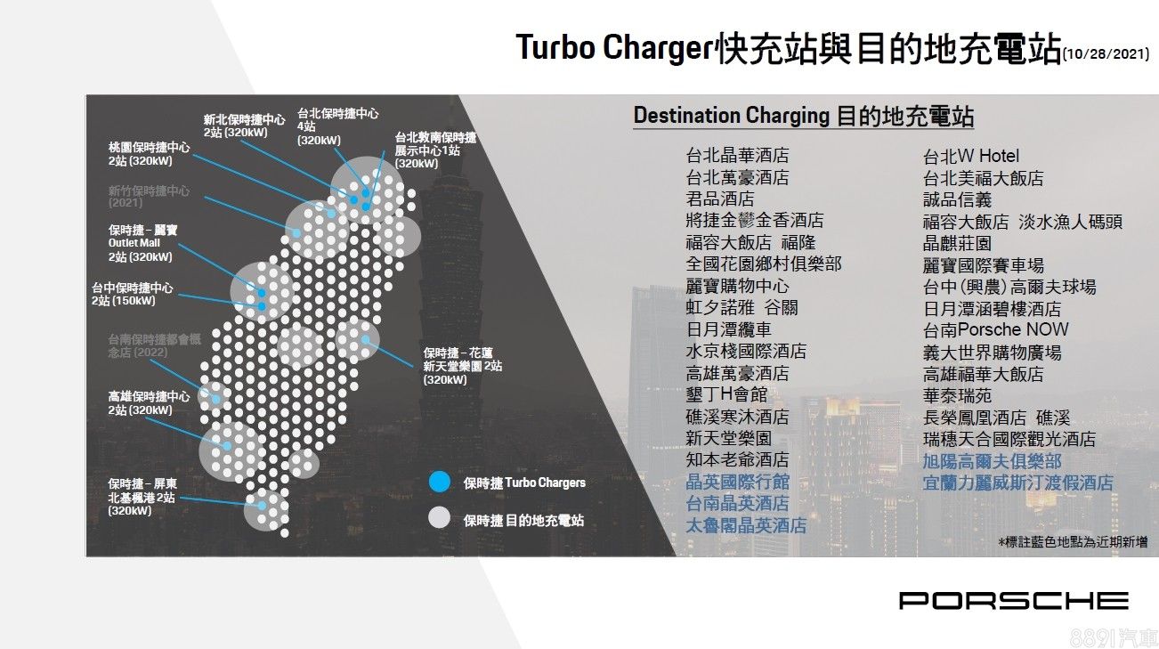 為了提供車主更便利的使用環境,在2021年10月另新增5處目的地充電站 ,分別位於宜蘭力麗威斯汀度假酒店、新竹旭陽高爾夫球俱樂部、高雄晶英國際行館、太魯閣晶英酒店和台南晶英酒店,隨著越來越多熱門旅遊景點也納入保時捷充電網路,Taycan車主可以更無後顧之憂地享受舒適的電動之旅。