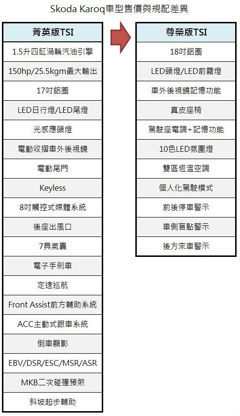 據目前已知消息,Skoda Karoq首波提供的為1.5 TSI單一動力,採2車型編成,分別為精英版與尊榮版,平均油耗均為16.8km/L,取得1級能源效率,而先前同在能源局油耗數據上出現的2.0 TDI柴油版本,預計當時僅先送測,稍晚才會導入。
