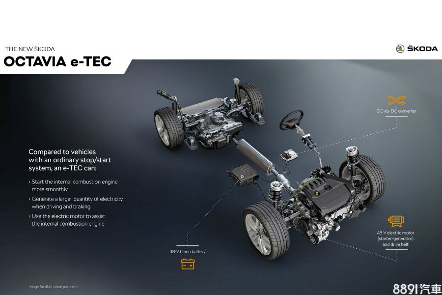 容量約0.6kWh的48V電池組安置於副駕駛座位下放,並僅能透過減速時的動能回收系統來進行充電。原廠指出,透過48V輕油電的價持,Octavia e-Tec在WLTP的測試下,每100km最多能省下0.4L的燃油消耗,換算下來平均油耗表現約能進步1.4~1.6km/L左右。