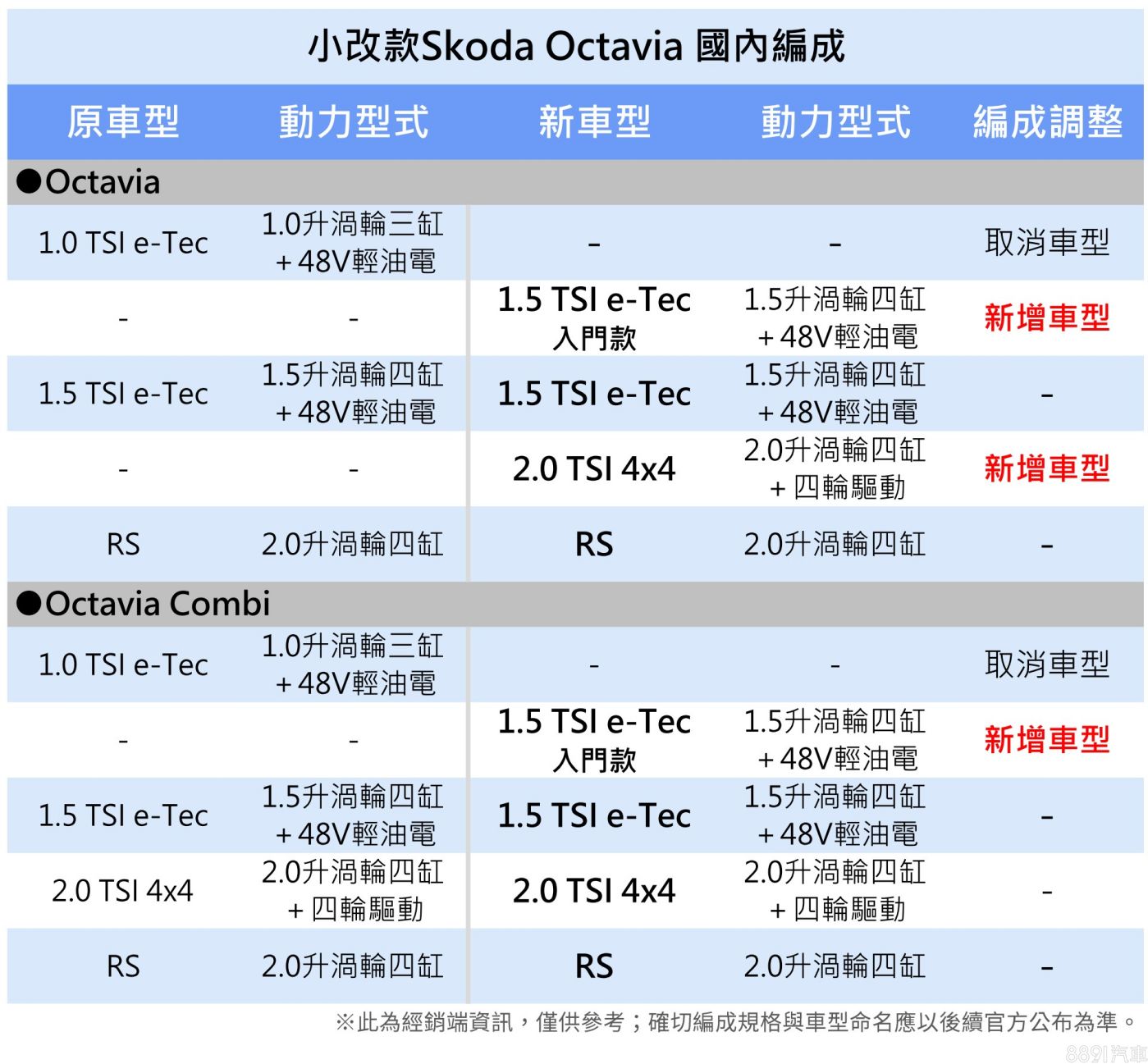 不過根據經銷端消息,車系小改後仍供應「Octavia」五門斜背和「Octavia Combi」旅行車型兩種車身型式,雙雙都規劃四種車型選擇,包含兩款「1.5 TSI e-Tec」輕油電渦輪四缸、一款「2.0 TSI 4x4」四驅車型和一款運動導向的「RS」車系頂規。