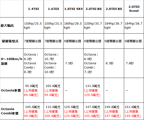 Skoda Octavia車系除了現有的1.6 TDI、Combi 1.8TSI與Combi RS之外,今日發表了多款新增車型,改由1.4 TSI轎車與旅行車作為入門款式,轎車版RS及旗艦款的Octavia Combi Scout也一併現身,此外,Combi 1.8TSI車型亦升級為四輪傳動系統。