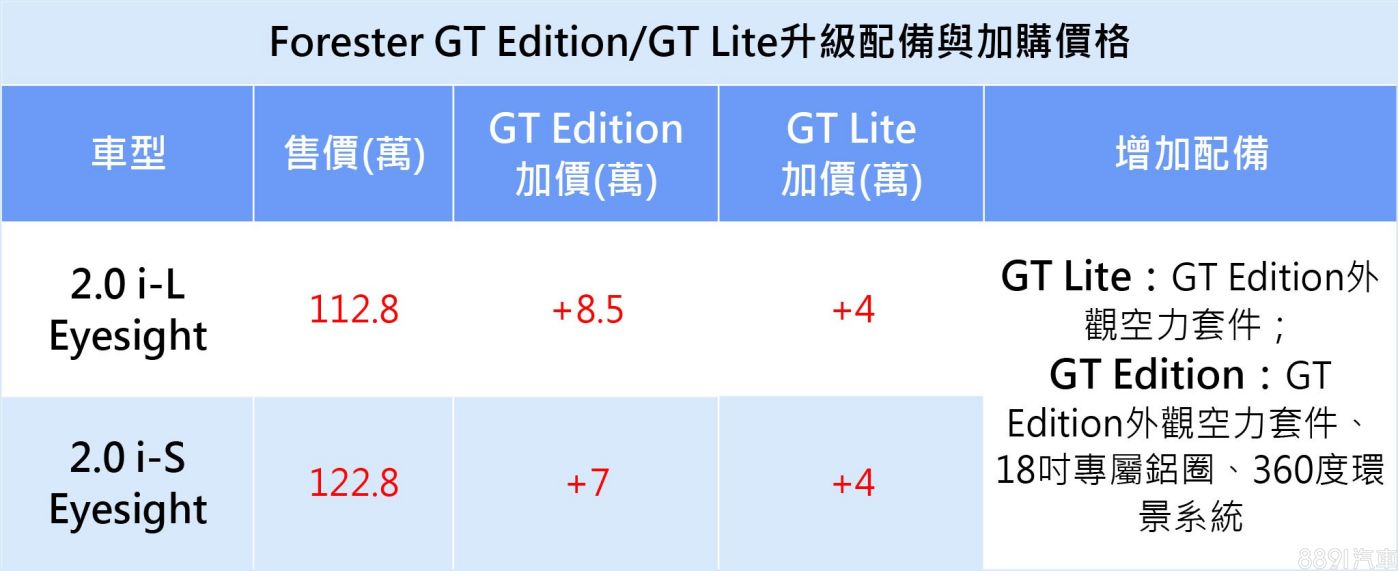 2021年式Forester目前提供2.0 i-L Eyesight、2.0 i-S Eyesight兩車型,均可選擇升級為限量特仕版,依車型不同,加價4~8.5萬元不等,重點資訊如附表。
