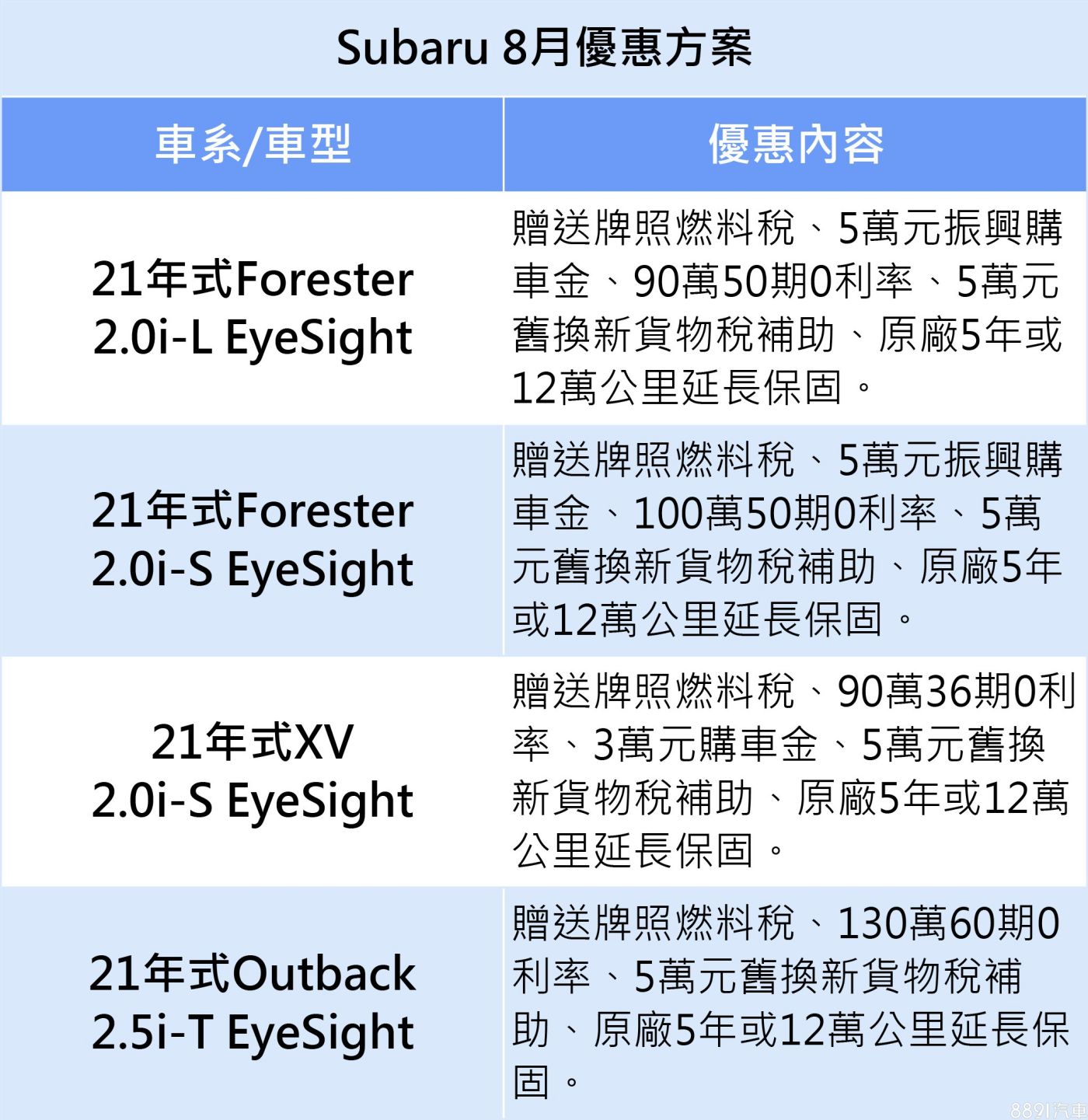 即日起至8/31止,入主Subaru全車系,可享首年牌照燃料稅減免、高額分期零利率優惠外,還加碼回饋振興購車金,舊換新最高可享總價值13.8萬元之優惠。