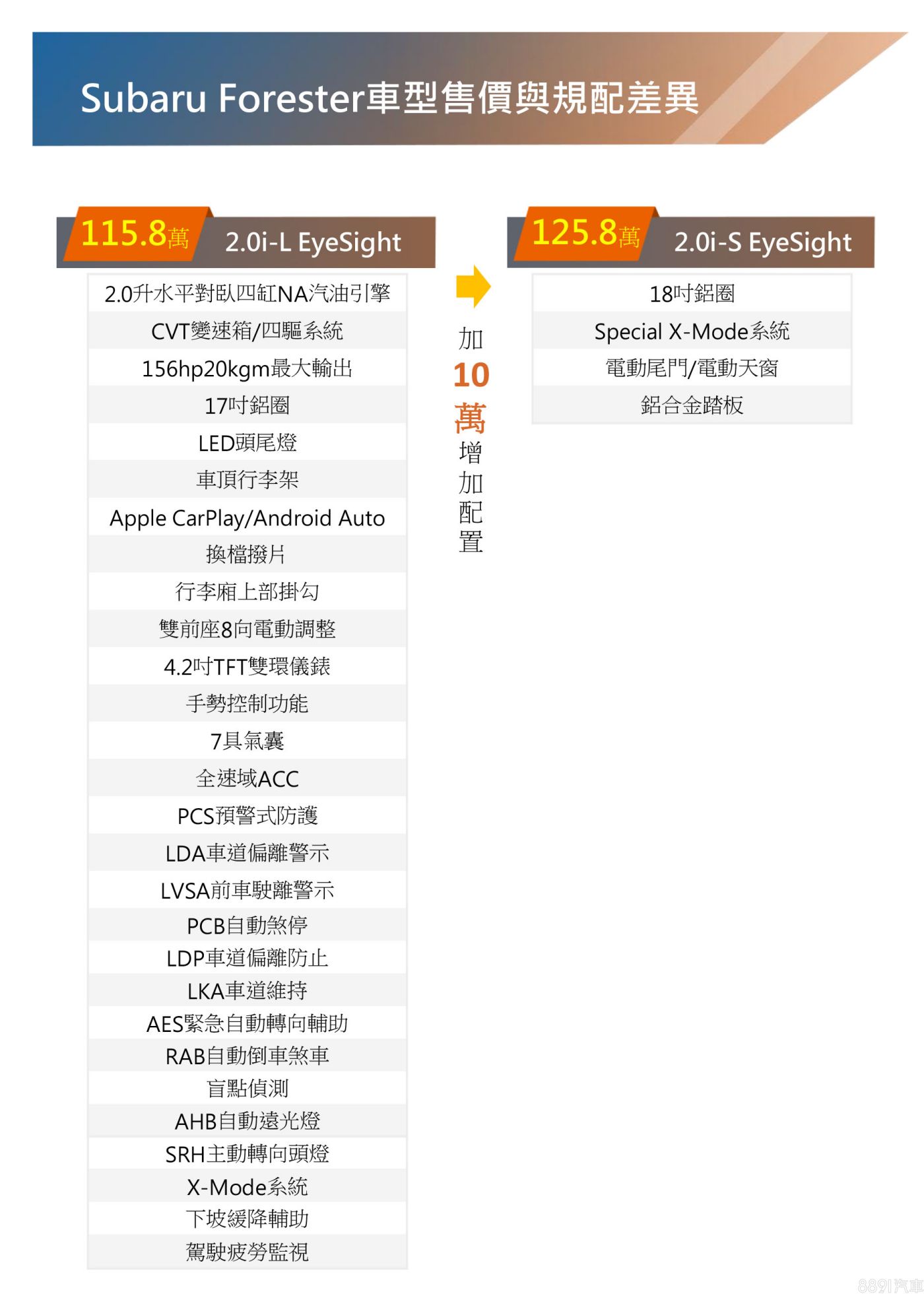 小改款Forester車型編成比照舊年式,提供2.0i-L EyeSight、2.0i-S EyeSight兩車型,正式售價分別為115.8、125.8萬元,與欲售價持平,比起先前有著3萬之漲幅,但依舊提供112.8、122.8萬之限量優惠價,在如今不少車款新年式都漲價的狀況下,算是有「逆勢操作」的效果,新車各車型重點規配差異如附表。