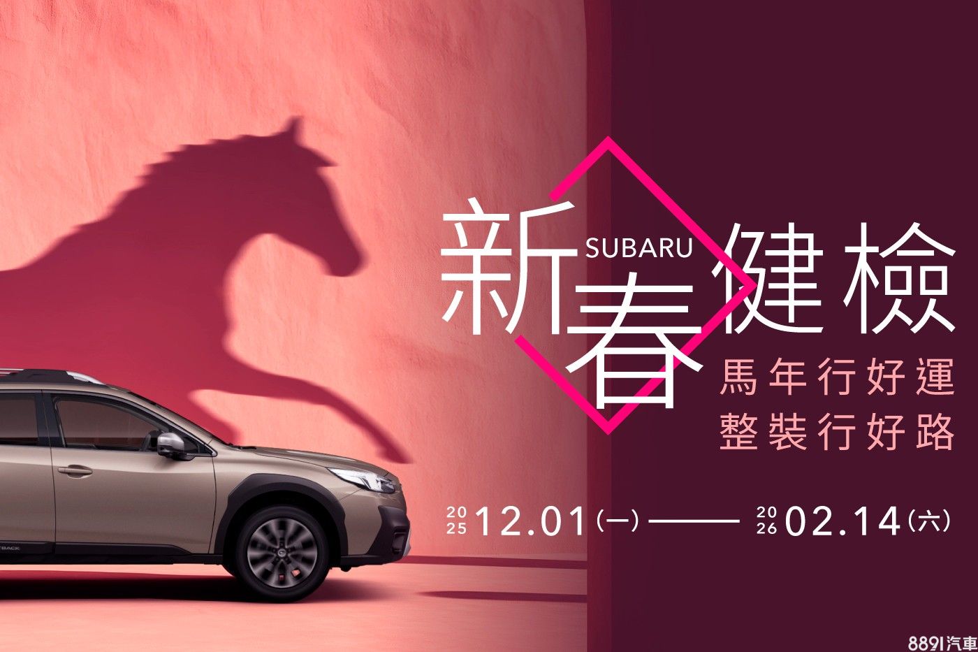 Subaru台灣意美汽車為確保每位車主的愛車都能維持最佳車況、開心出門平安回家,自即日起至2026年2月14日止,特別規劃「2026 Subaru新春健檢」活動,凡於活動期間預約回廠即可享有「迎馬年7大回饋」禮遇,除了貼心提供全車5大系統36項免費健檢外,更享指定品牌輪胎及胎壓偵測器與原廠零配件等多重優惠回饋;此外單筆消費滿額再享品牌精品好禮相贈,歡迎全台車主提前預約回廠參加新春健檢活動。