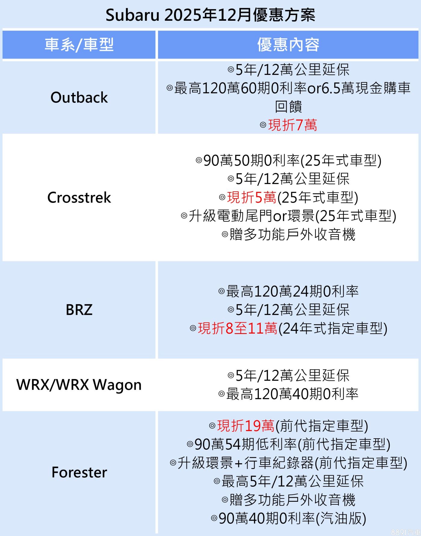 本月優惠的最大焦點,絕對是Forester!原廠針對前代指定車型,開出現金折19萬元的超狂優惠,不僅如此,還能再享90萬54期低利率方案,並升級環景影像與行車紀錄器,大改款版本則送多功能戶外收音機,且提供最高90萬40期0利率的優貸。