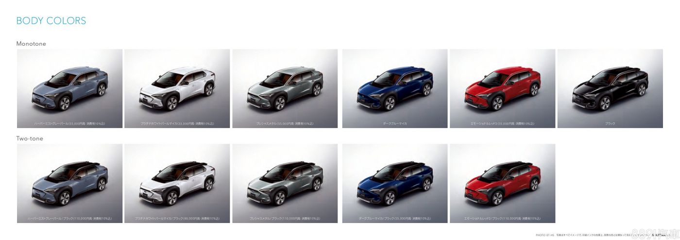 外觀配置部分,日規Solterra鋁圈標配18吋,僅頂規版獨享20吋,除了標準車頂外,亦可選全景玻璃天窗或太陽能充電板,車色部分則提供6種單色,另有「Two-tone」黑色車頂的選配。