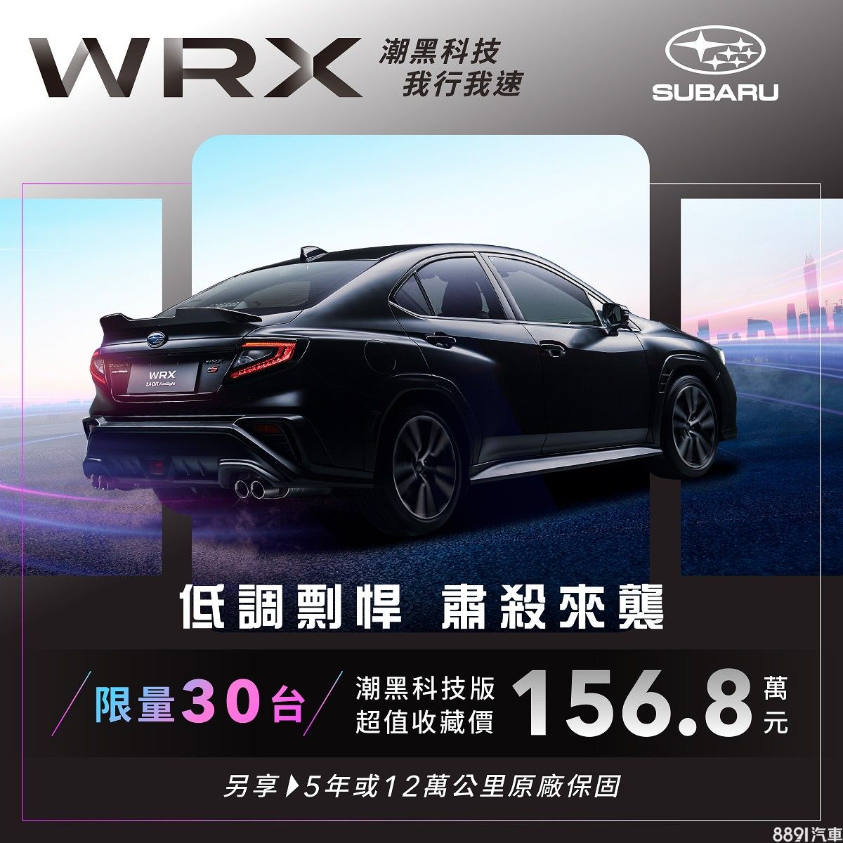 WRX潮黑科技版升級全車TPU黑色消光膜、運動鴨尾、360環景與雙鏡頭電子後視鏡,開價156.8萬元、限量30台。