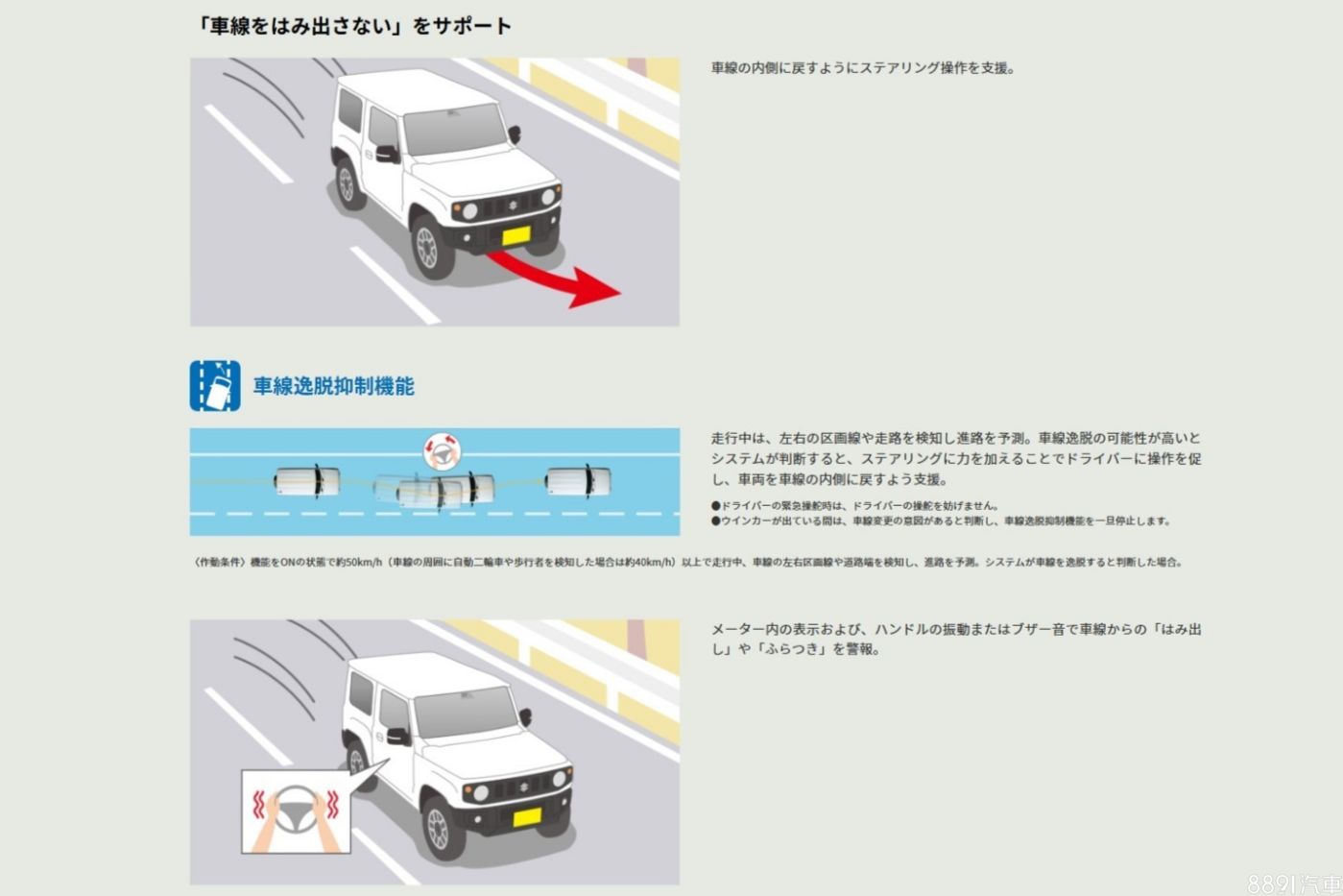 原本Jimny僅有車道偏離警示,新年式追加車道偏離抑制功能,當系統偵測到車輛偏離車道,即會施以反向方向盤輔助力道,協助車輛回到車道線內。