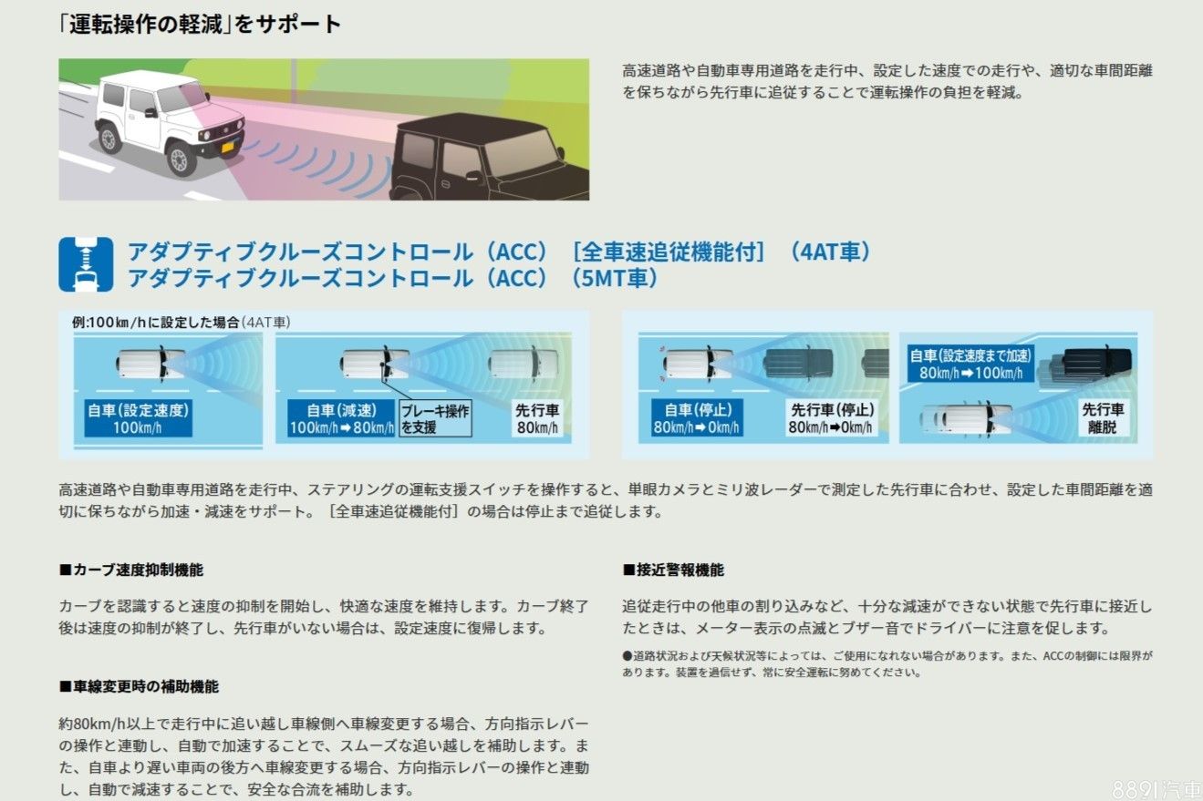 新年式Jimny全車系均搭載ACC主動式車距巡航控制系統,不過僅4速自排的版本才會是全速域ACC,能支援低速跟車及停車再開功能。