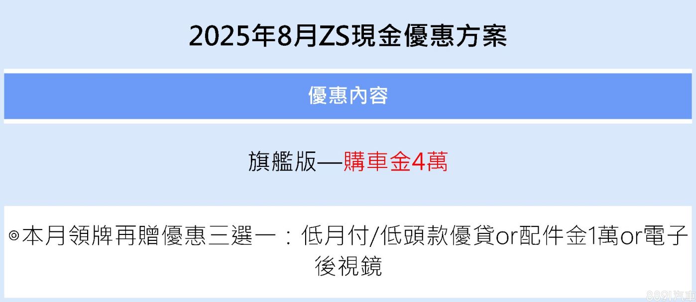 MG ZS旗艦版本月祭出4萬元購車金,可折抵車價或轉換為低月付/低頭款優貸、1萬元配件金,或升級電子後視鏡三選一。ZS兼具歐風外型與完整配備,特別適合追求外觀質感與高CP值的年輕買家,靈活的優惠方式更能符合不同購車需求。