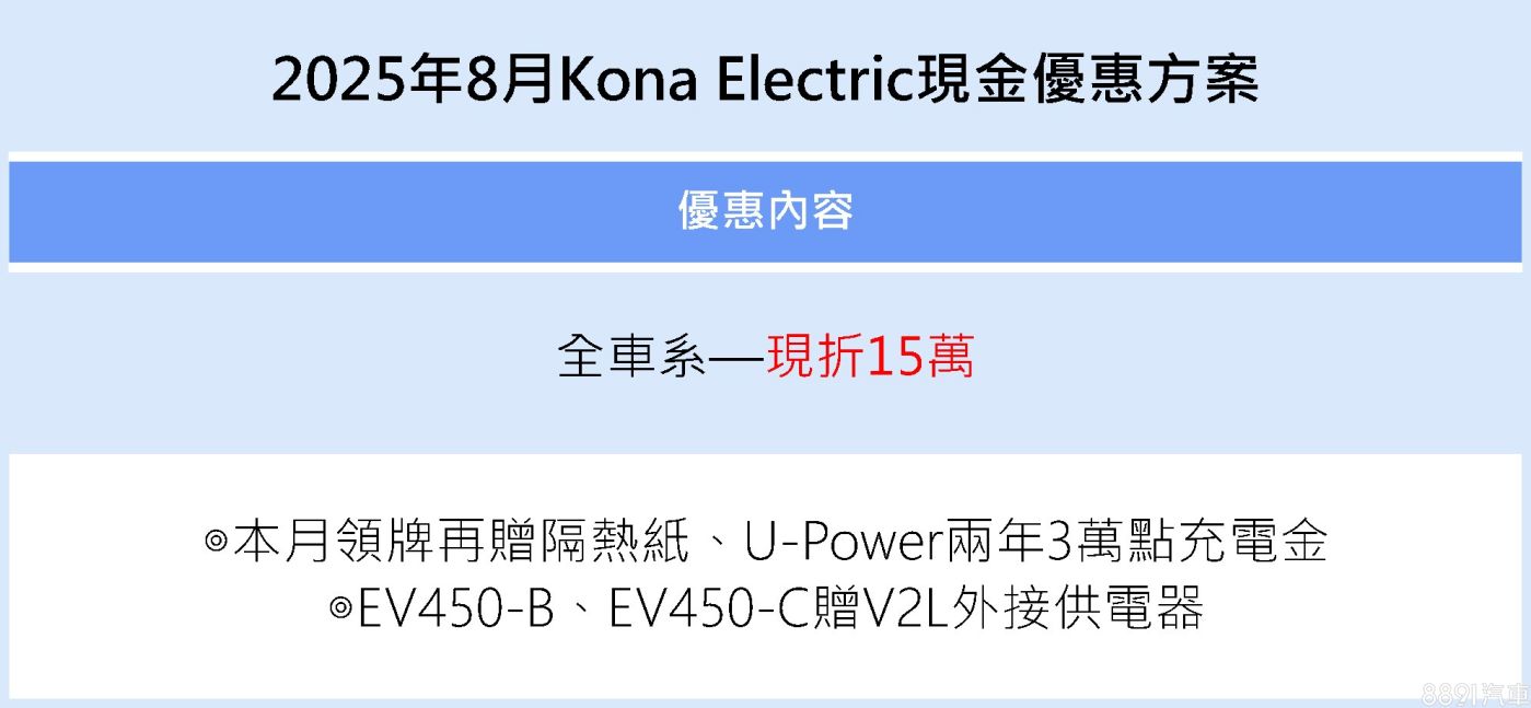 Hyundai Kona Electric全車系現折15萬元,再送隔熱紙與U-Power兩年3萬點充電金。EV450-B、EV450-C車型更加碼V2L外接供電器,讓車輛化身行動電源。438km續航與800V快充架構,長途與日常通勤皆能兼顧。
