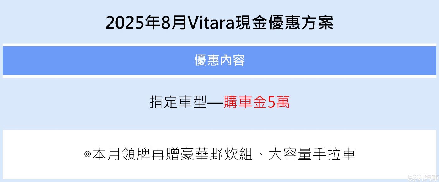 Suzuki Vitara同步推出5萬元購車金優惠,並附贈豪華野炊組與大容量手拉車。Vitara主打輕巧車身與進口四驅規格,讓買家可兼顧都會通勤與輕度越野體驗,是喜歡週末探索郊區的駕駛好選擇。