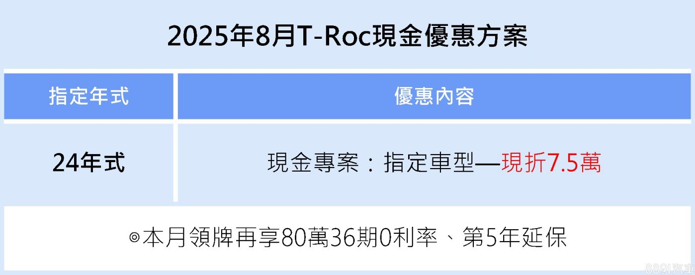 Volkswagen T-Roc(24年式)8月現折7.5萬元,並提供80萬36期0利率與第5年延長保固。T-Roc以紮實底盤與歐系操控聞名,本月優惠讓入手門檻更貼近大眾預算。